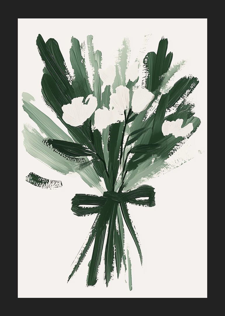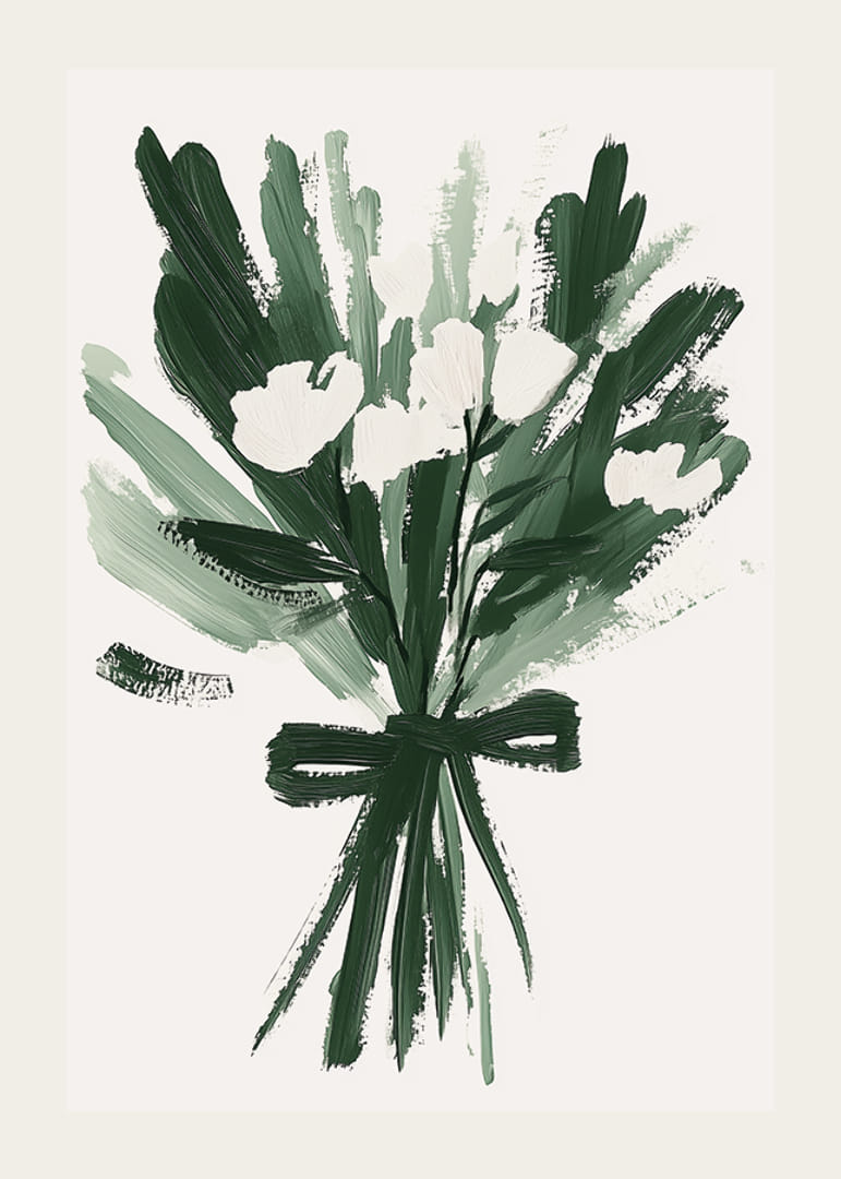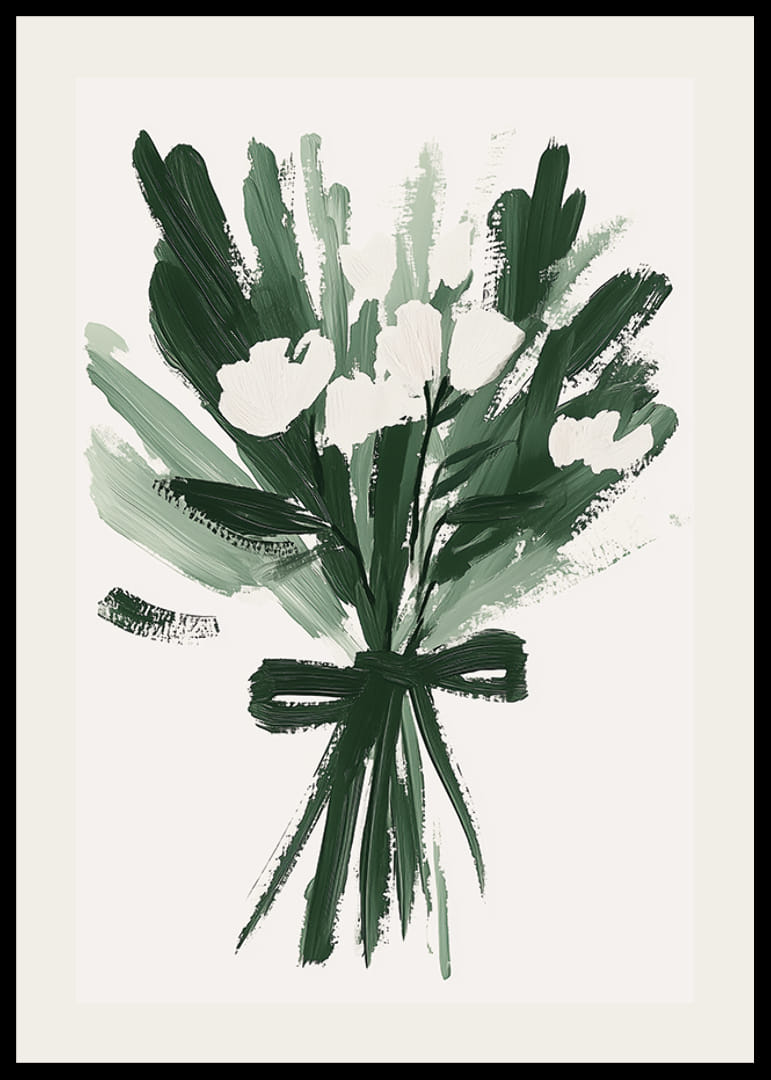 Denne plakat fanger opmærksomheden med sine livlige grønne og hvide penselstrøg, der danner en elegant buket blomster. Det grafiske og abstrakte udtryk kombinerer kunstnerisk frihed med naturens skønhed.