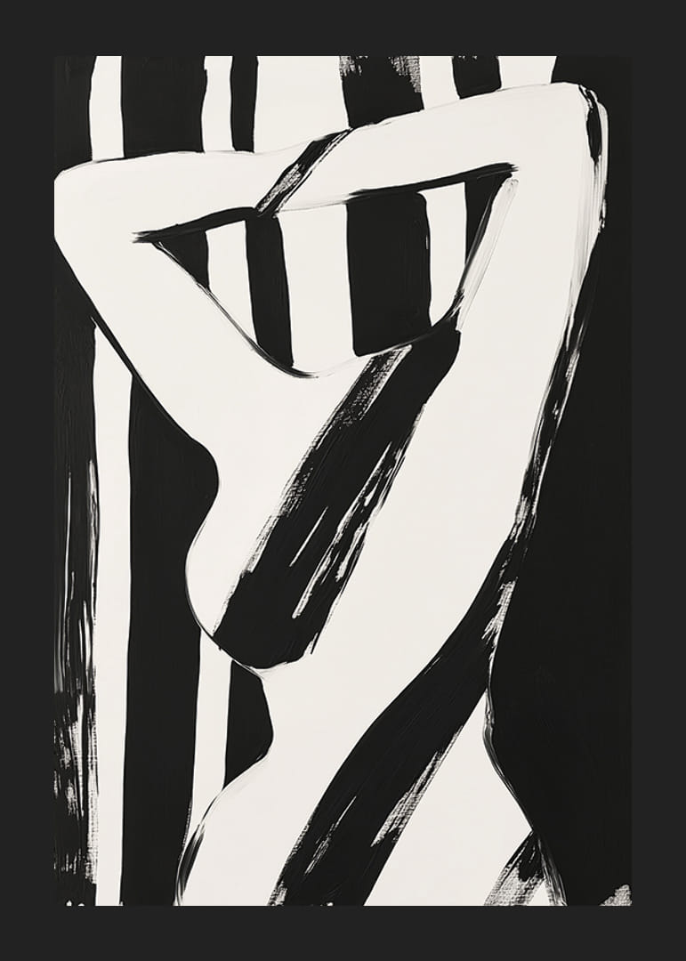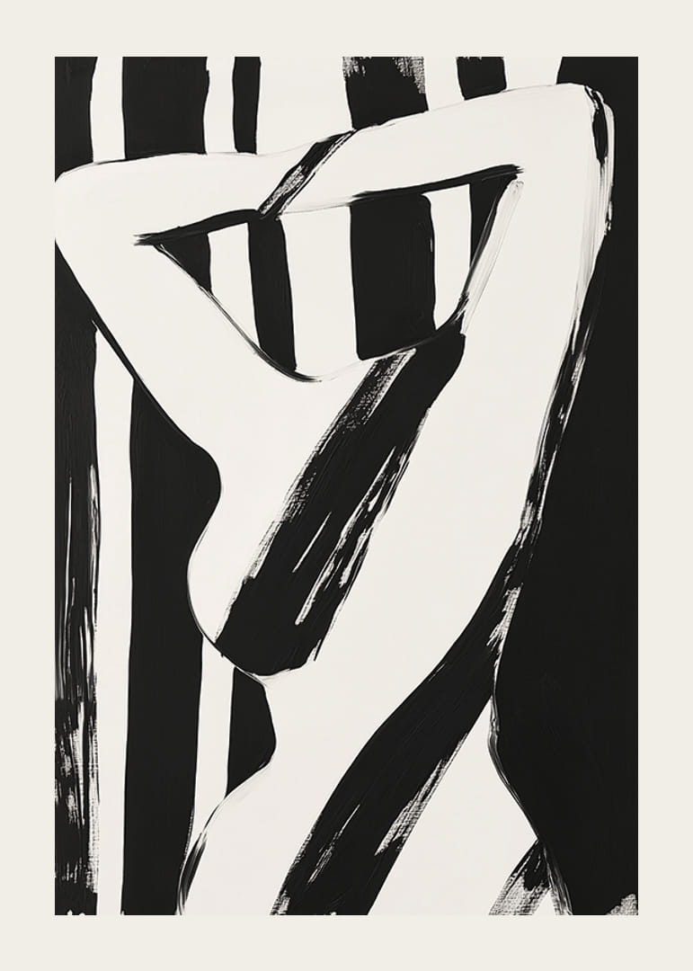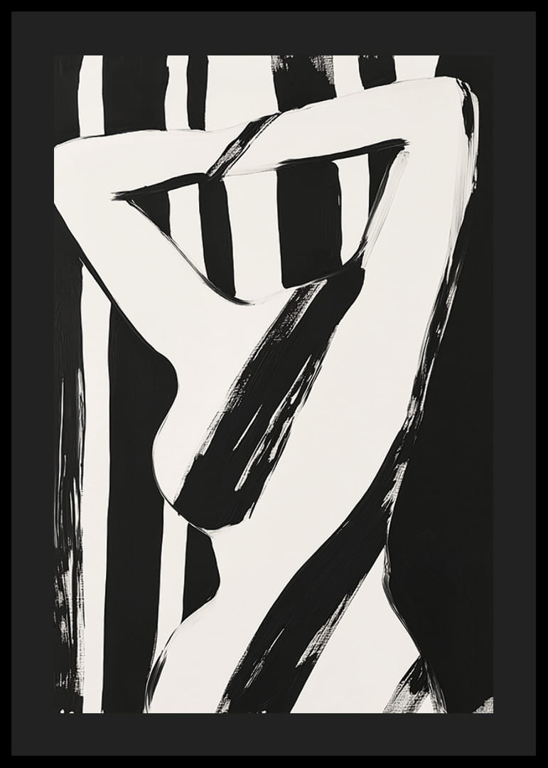 Denne plakat indleder en fascinerende dialog mellem skygger og lys. De elegante linjer vælter ud over det hvide lærred og skaber en hypnotisk følelse af bevægelse. Hver kurve og hver linje harmonerer i en abstrakt symfoni, der inspirerer og fortryller.