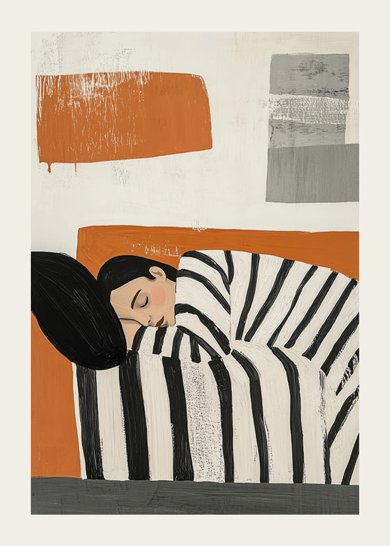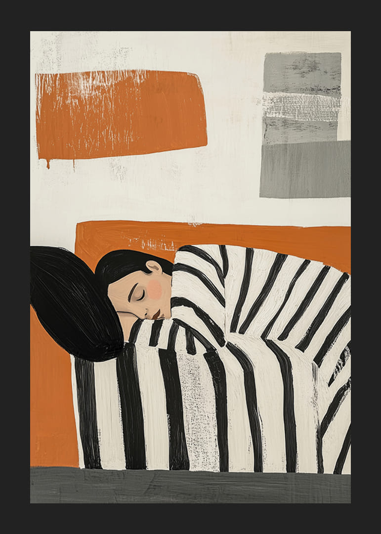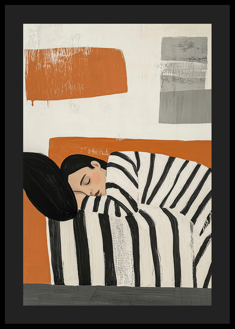 Denne plakats kunst indfanger en fredelig sovende scene, hvor sorte og hvide striber omfavner den hvilende person mod en varm orange baggrund. Det abstrakte og moderne udtryk skaber en følelse af enkelhed og ro.