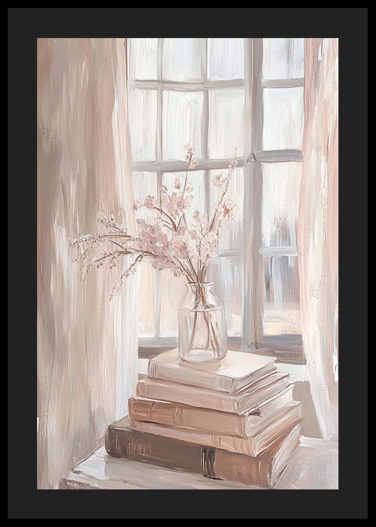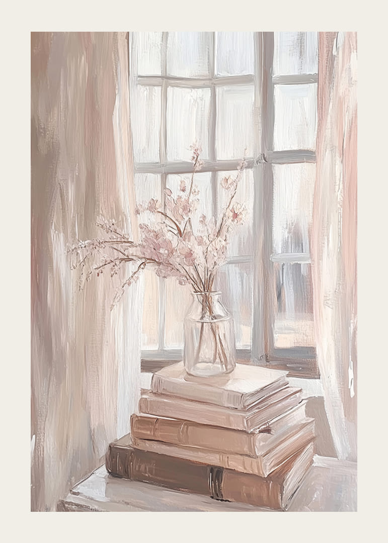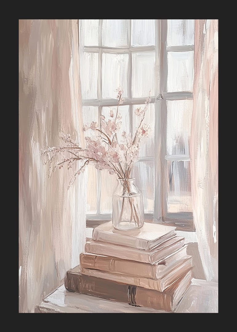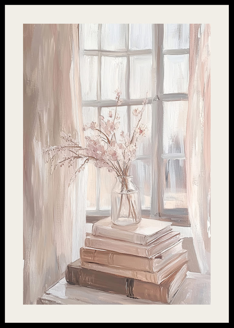 Denne plakat fanger et øjebliks ro med bløde blyantstrøg og blide nuancer. En buket sarte blomster i en glasvase hviler på en bunke bøger, hvis varme solstråler spiller gennem vinduet. Den viser en perfekt balance mellem lys og skygge, hvilket skaber en følelse af fred i rummet.