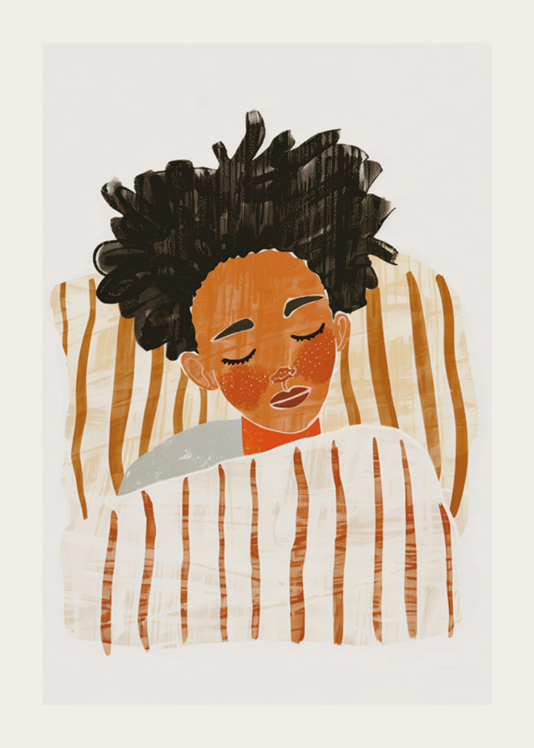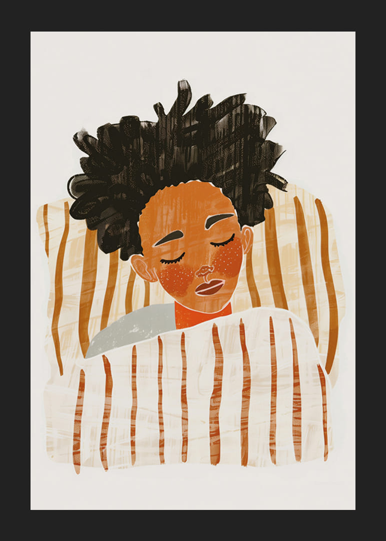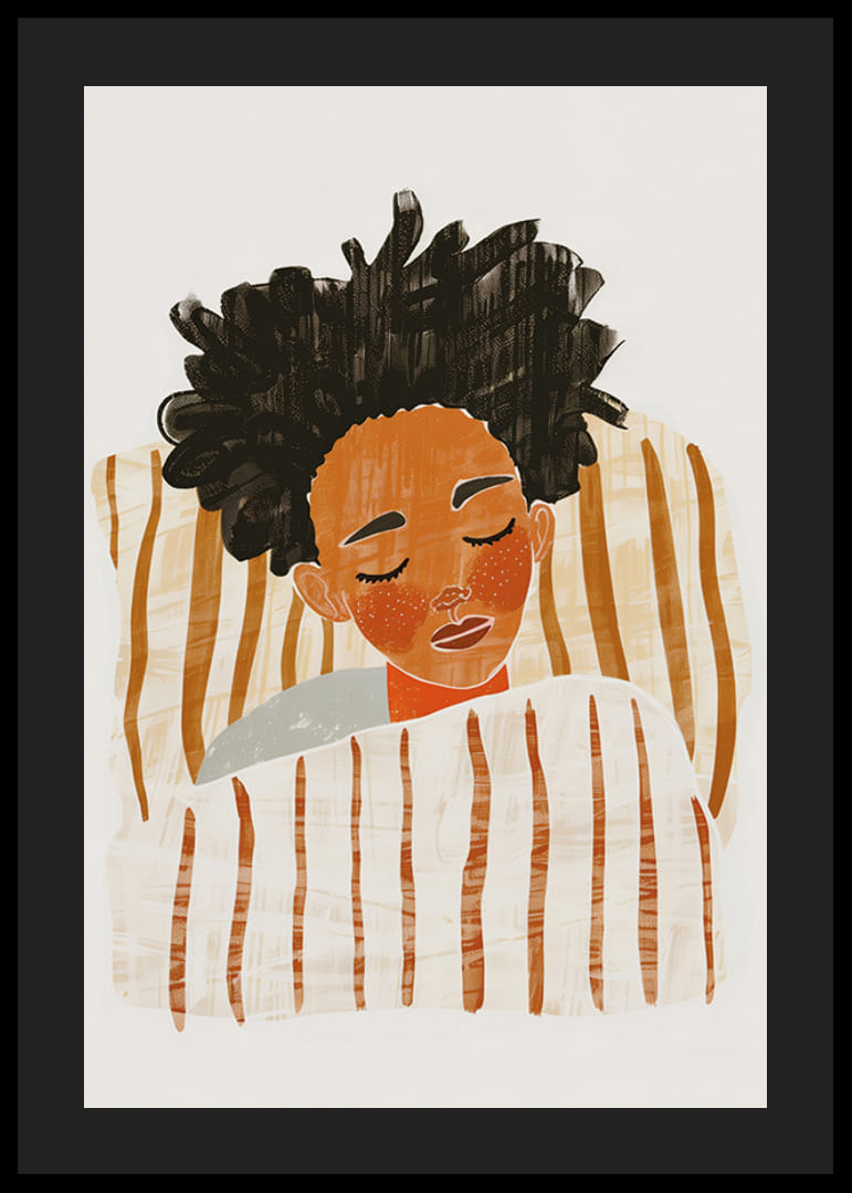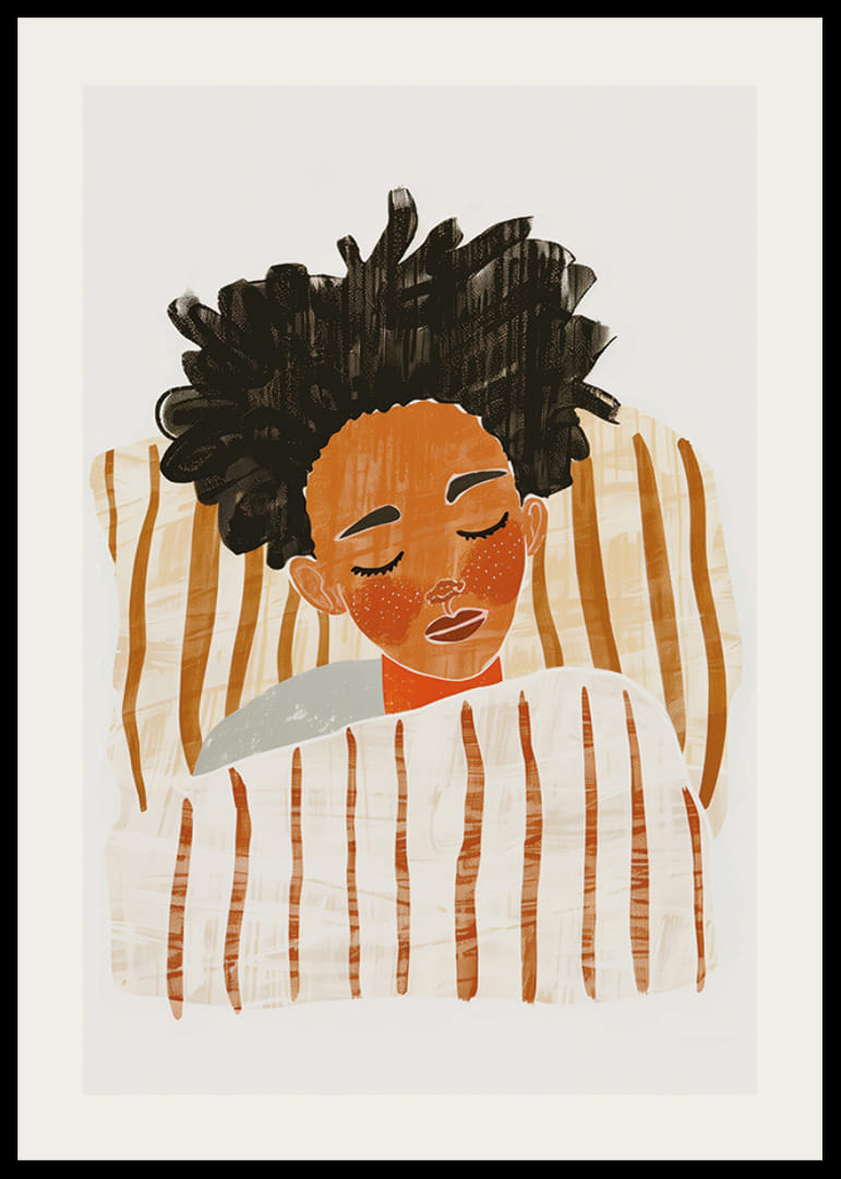 Denne plakat fanger øjeblikket med total fred, når en person sover indhyllet i bløde, stribede tæpper. De varme, jordnære farver skaber en atmosfære af ro og tryghed. Kontrasten mellem det mørke hår og de lyse tæpper bidrager til en harmonisk balance, der beroliger sindet.