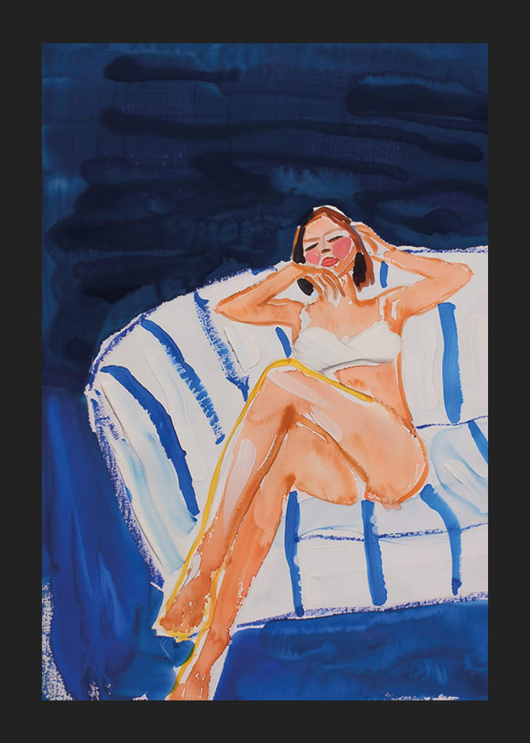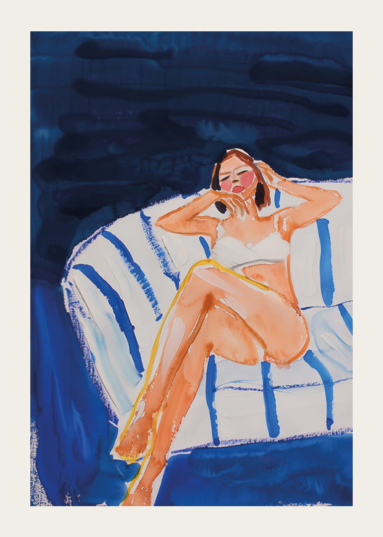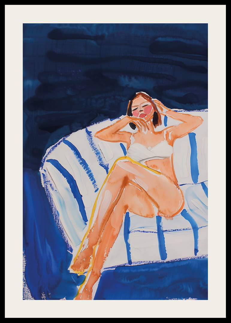 Denne plakat fanger en harmonisk scene, hvor en kvinde afslappet nyder et øjebliks stilhed. Maleriets bløde penselstrøg og kølende blå toner skaber en atmosfære af rolig og drømmende afslapning.