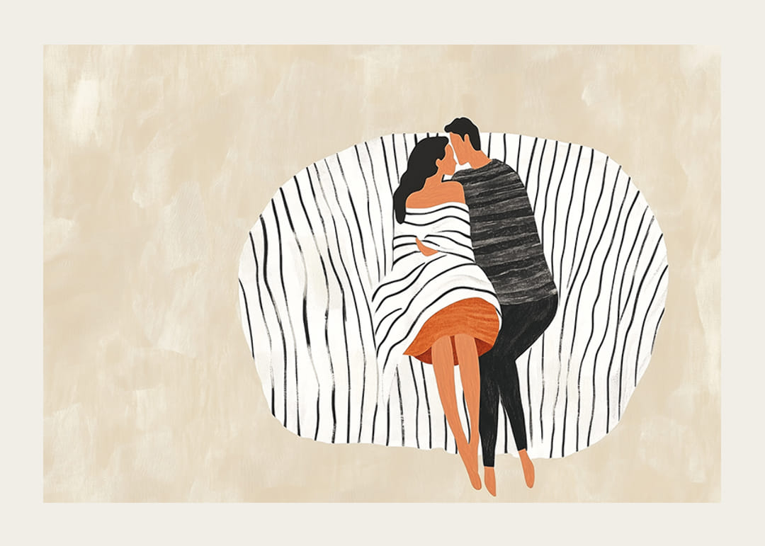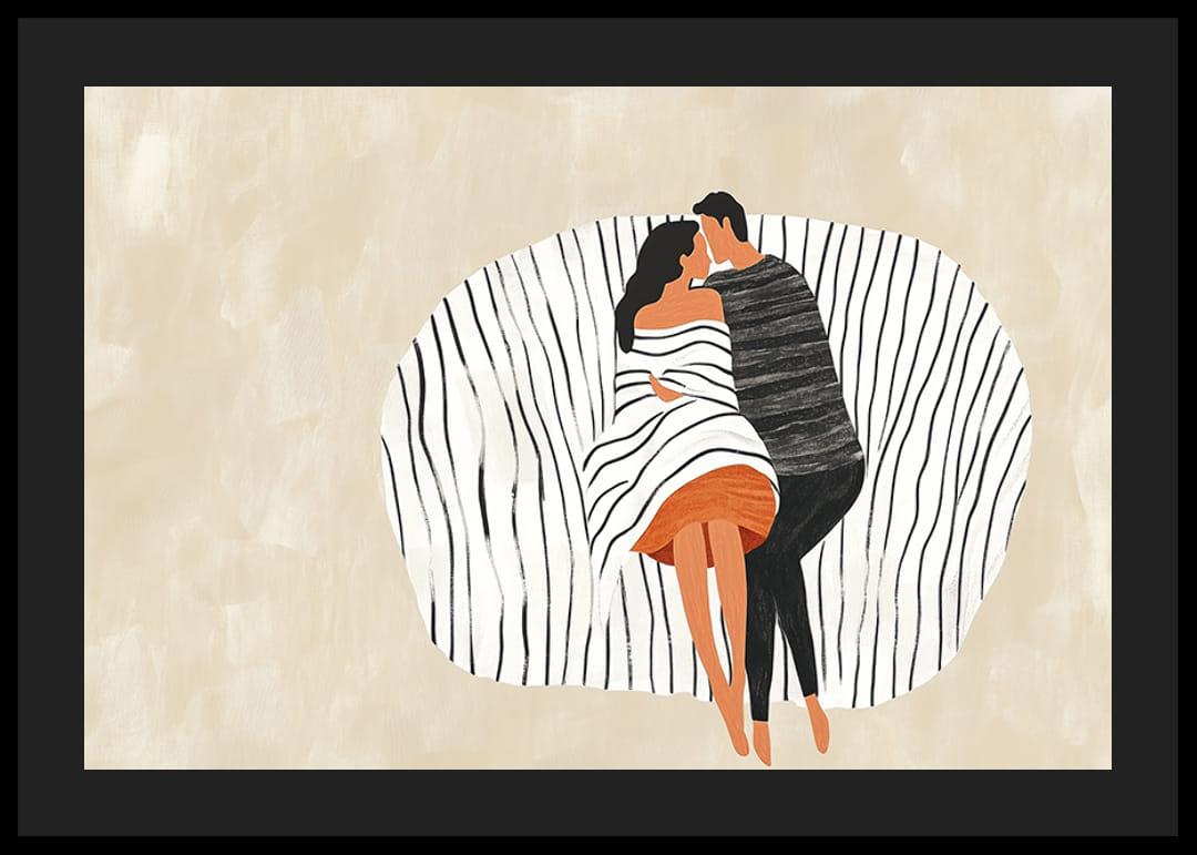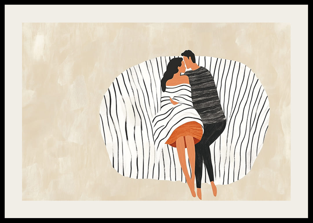 Denne plakat fanger to elskende i en intim omfavnelse, beliggende på baggrund af bløde, bølgede linjer, der fremhæver deres forening. Farverne er dæmpede, hvilket giver en følelse af ro og harmoni.