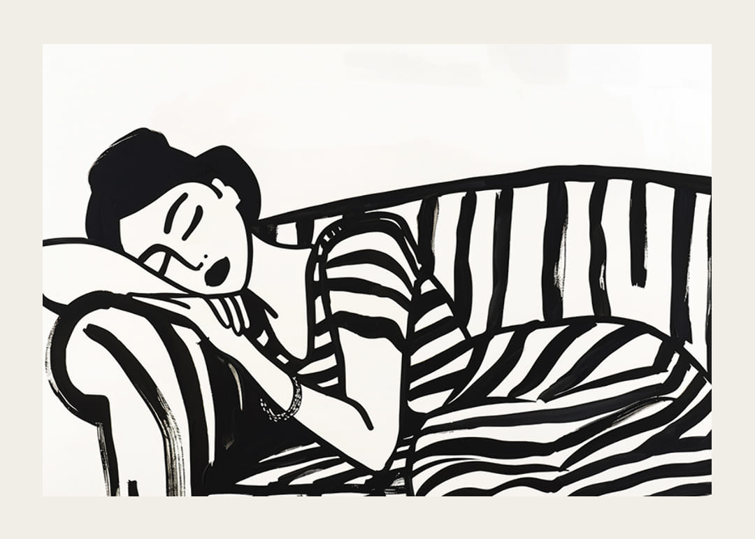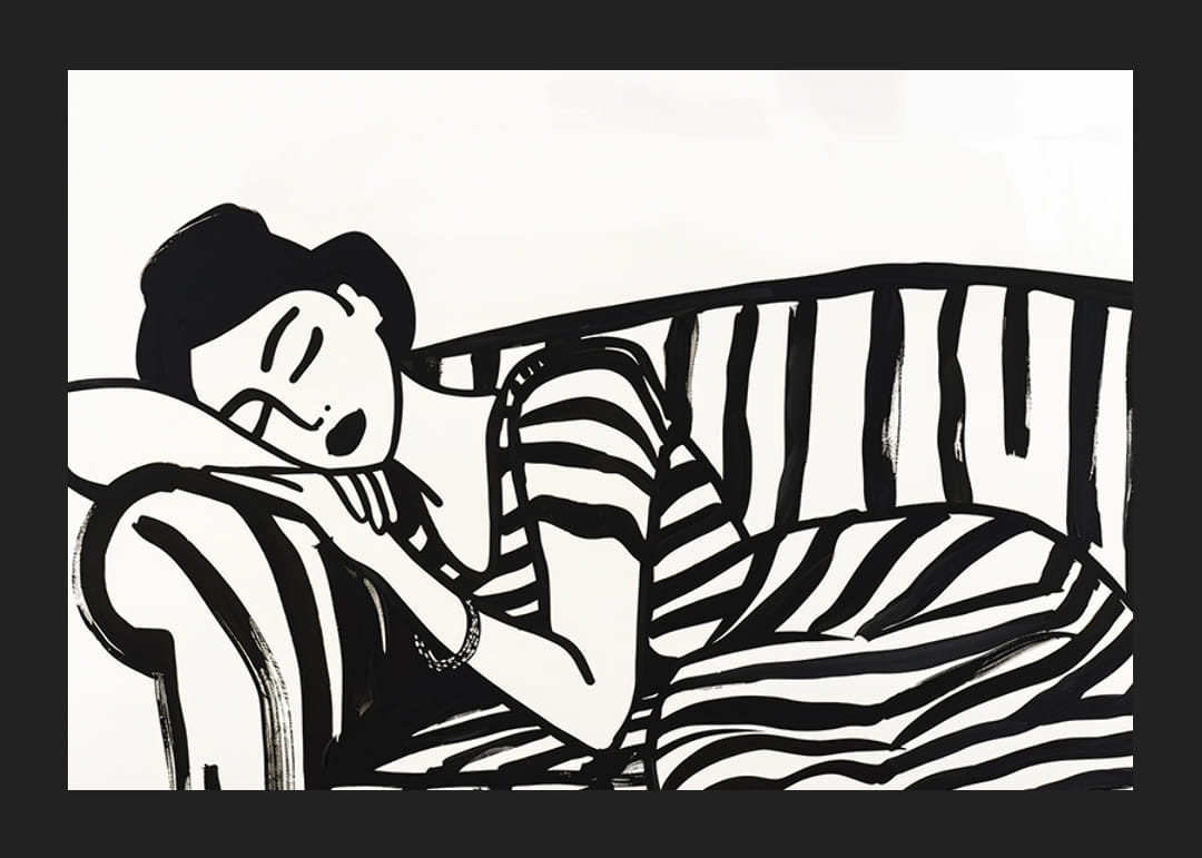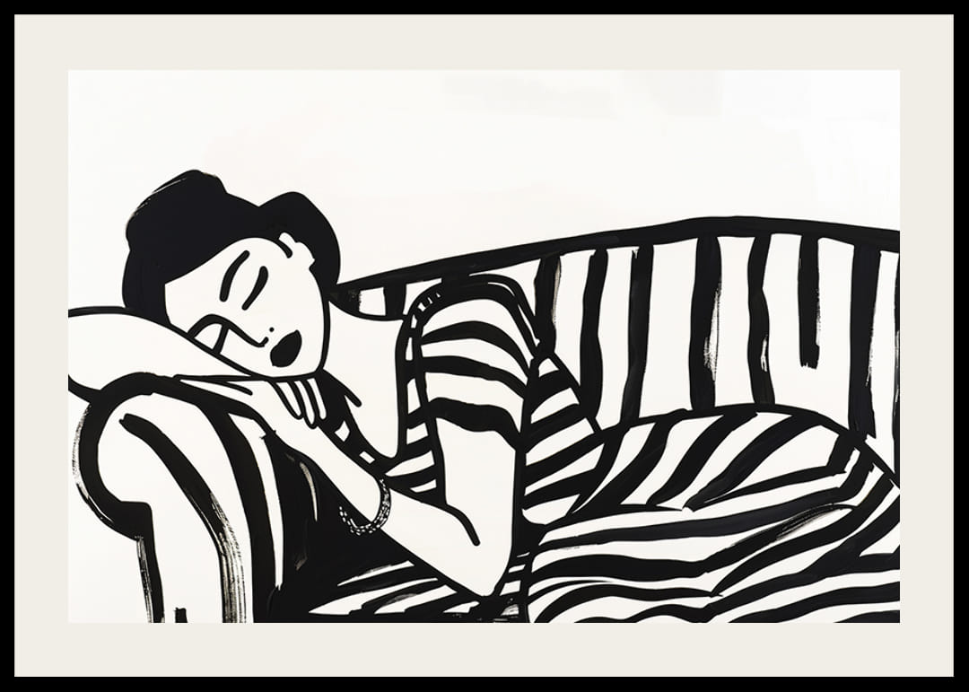 Oplev en følelse af tidløs ro med denne plakat af en kvinde i monokrome striber, der hviler på en stribet sofa. Denne kunstnerisk fængslende komposition skaber en drømmeagtig atmosfære, der emmer af både ro og stil.