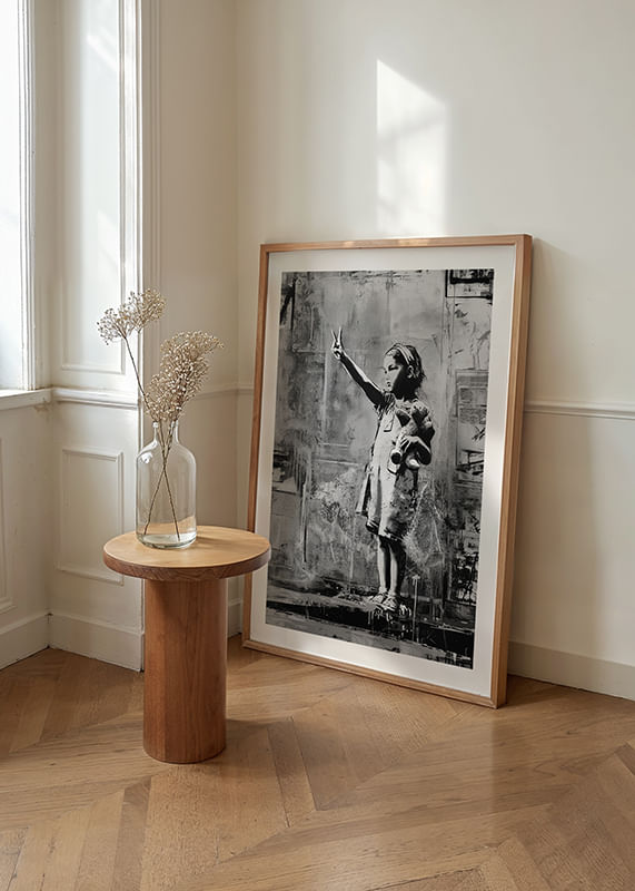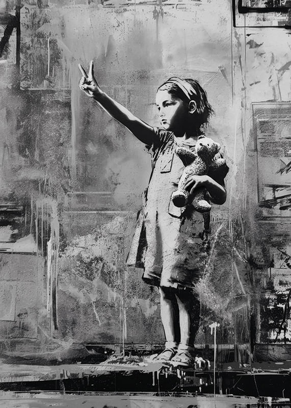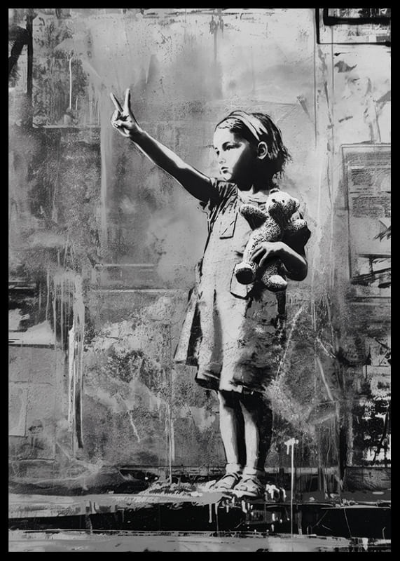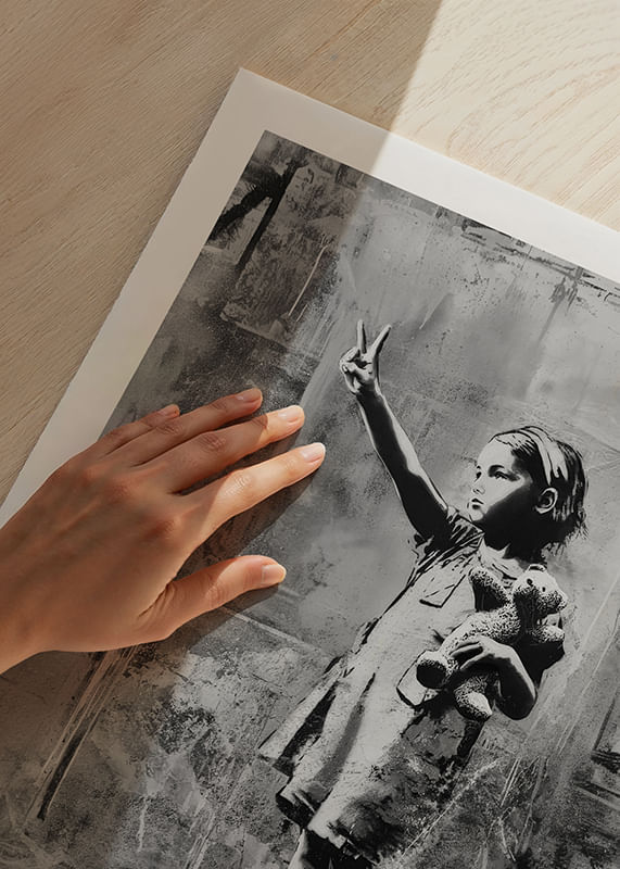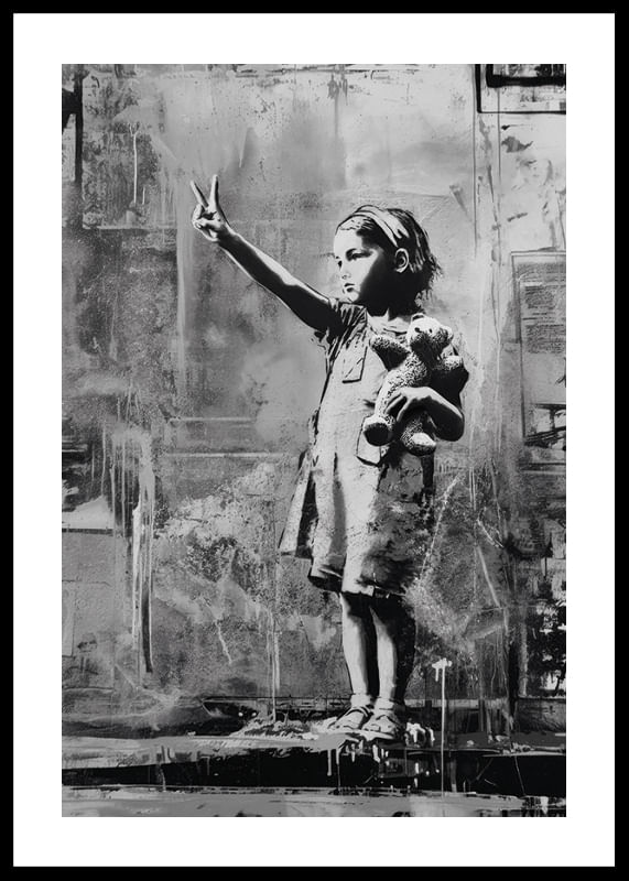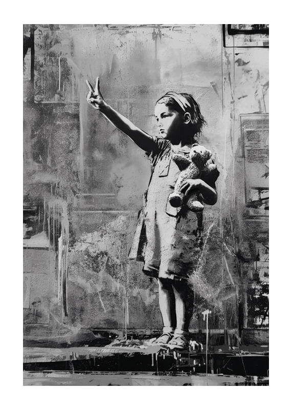 Young Voice viser en ung pige, der løfter hånden i en sejrsgestus, med en bamse i favnen og et ubøjeligt blik. I dette sort-hvide billede mødes barndommens blidhed og modstandens symbolik i et stærkt øjeblik. Værket hylder børns ret til at blive hørt, håbet i den næste generation og de små stemmer, der bærer de største budskaber. En plakat til dem, der tror på forandring gennem venlighed og empati. Denne plakat er en del af Non-Violence Collection, hvor hvert køb støtter The Non-Violence Projects vigtige arbejde med at forebygge vold.