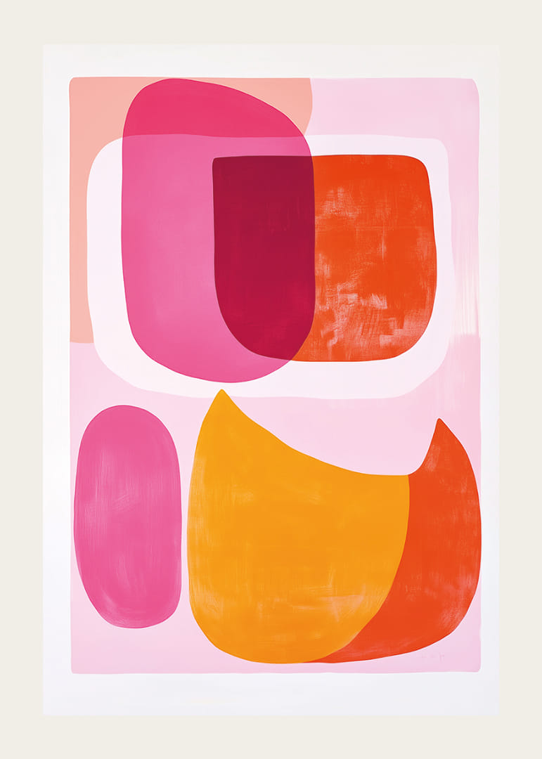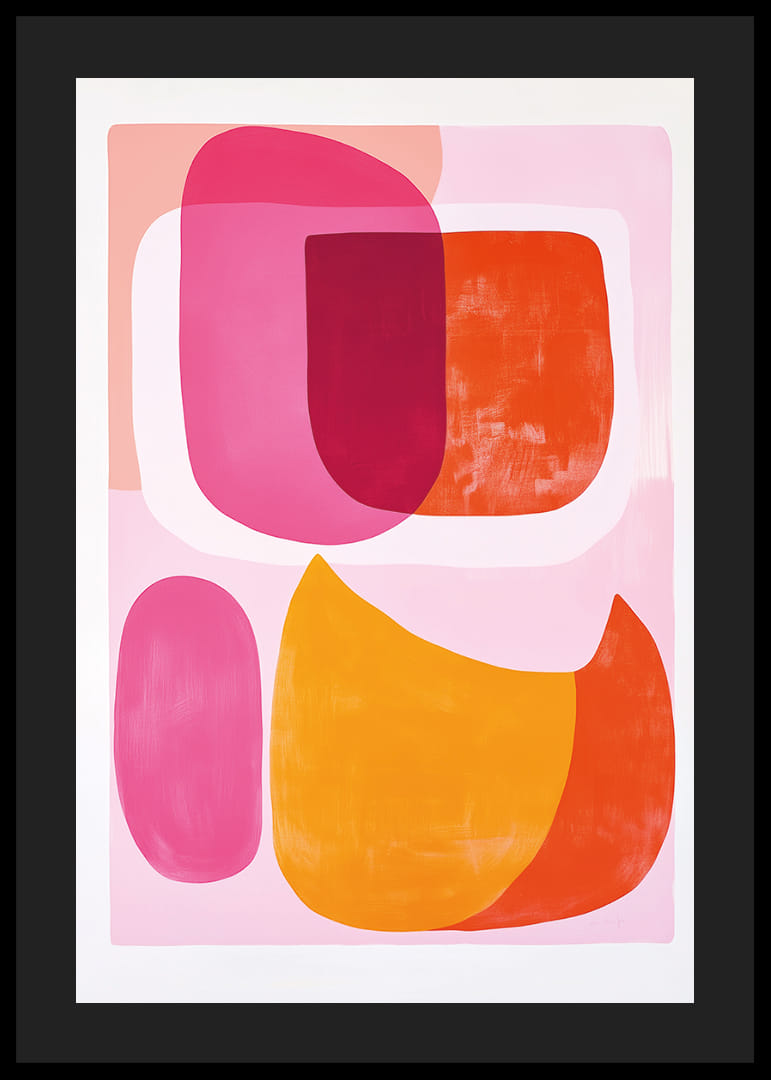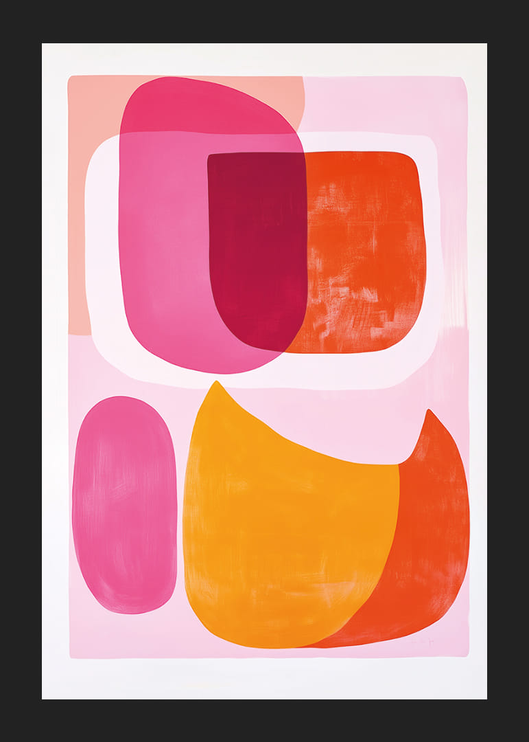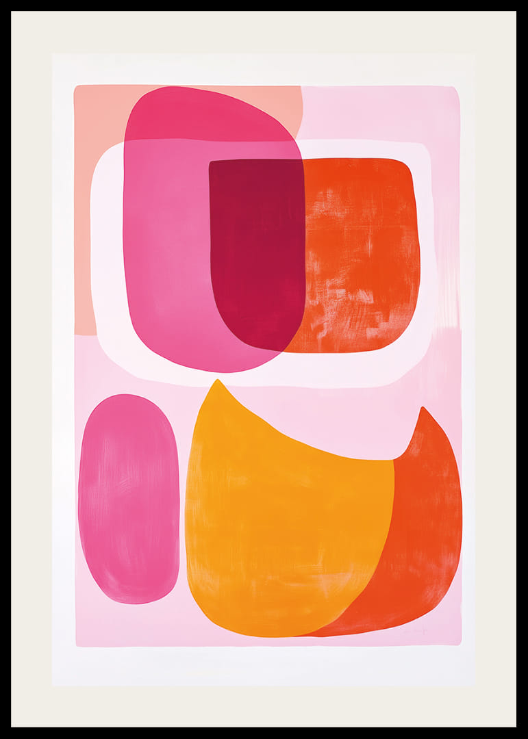 Oplev kraften i denne plakat, der forener et kalejdoskop af lyserøde og orange toner, hvis livlige former danser harmonisk hen over overfladen. Det dynamiske møde mellem farvefelter skaber en følelse af glæde og energi. Dette kunstværk forvandler ethvert rum til et sted med inspiration og livlighed, hvor plakatens udtryksfulde energi forbedrer hjemmet med stil og tilstedeværelse.