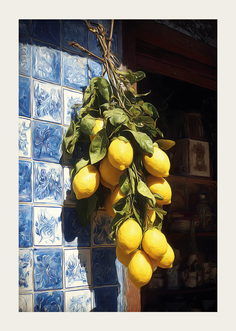 En plakat, der straks fanger din opmærksomhed med sine strålende, gyldne citroner, der hænger op mod en smuk azulejo-væg. De intense farver og det blændende sollys skaber en varm og levende atmosfære, der giver en følelse af middelhavsk kærlighed og sommerlig friskhed. Denne plakat er perfekt til at lyse køkkenet eller stuen op og til at give dit rum en følelse af friskhed og elegance.