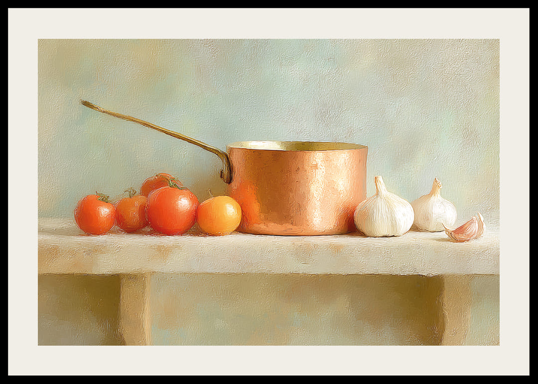 Denne plakat indfanger essensen af ​​rustik elegance med en varm kobbergryde, der harmonerer med friske tomater og hvidløg. Farverne er bløde og jordnære og skaber en hjemlig atmosfære. Den subtile tekstur i baggrunden forstærker den nostalgiske følelse. Med denne plakat bliver dit køkken et kunstnerisk udtryk, hvor tradition og skønhed smelter sammen i hverdagen.