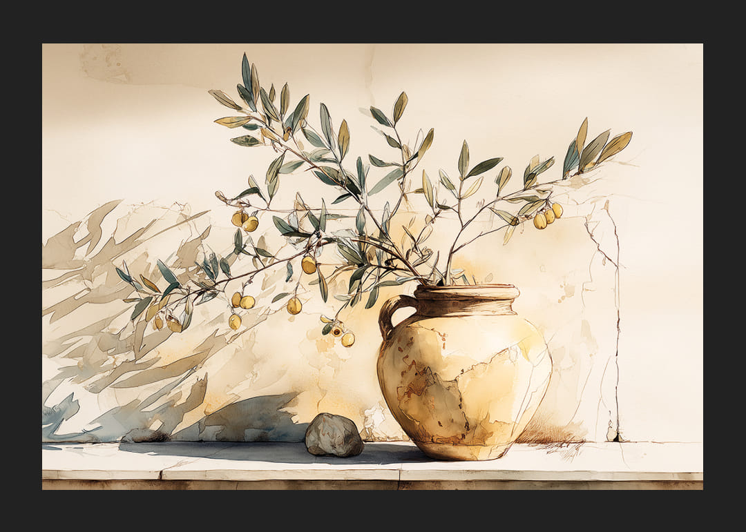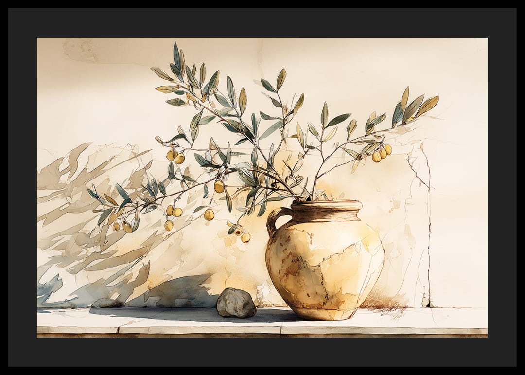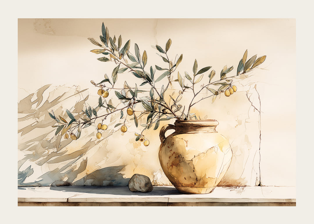 Denne plakat indfanger en tidløs skønhed med sit motiv af en antik potte prydet med olivengrene. De gyldne toner og skyggespillet skaber en varm, solrig atmosfære, der straks tiltrækker beskueren. Detaljerne er omhyggeligt gengivet og skaber en følelse af rustik elegance. Placer denne plakat i din stue for at tilføje et strejf af ro og enkelhed, der komplementerer enhver indretningsstil.