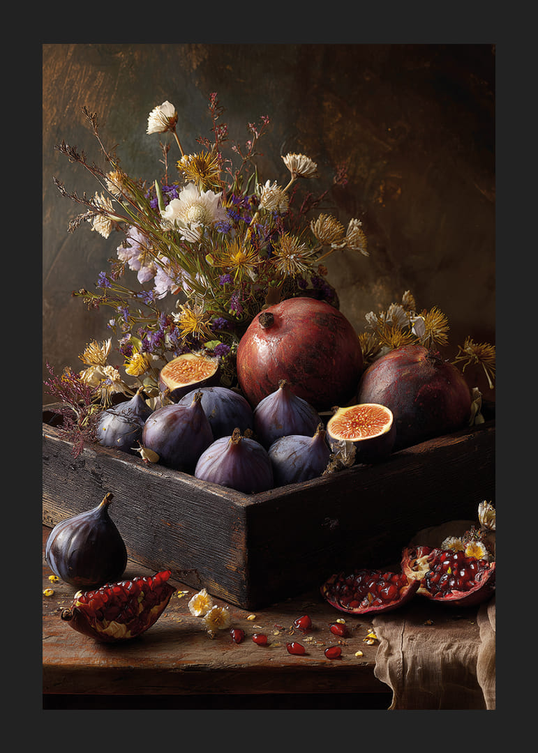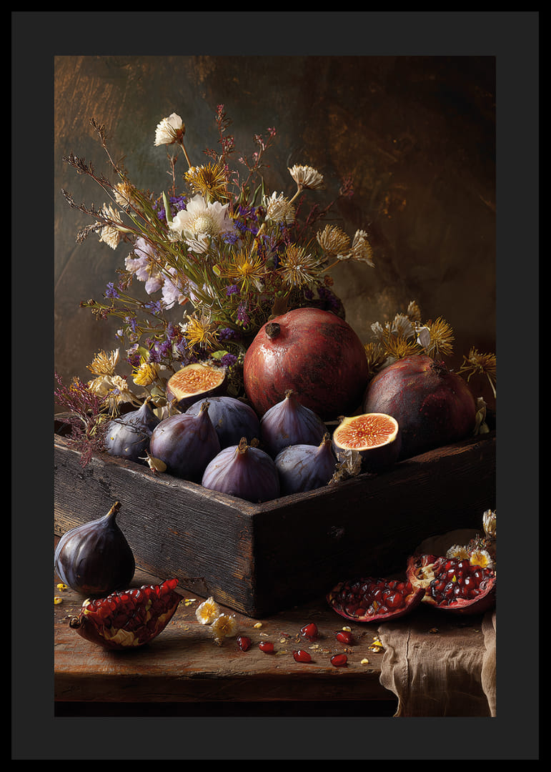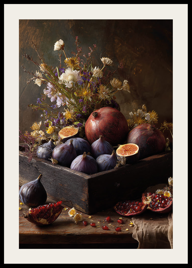 Denne plakat indfanger en varm og jordnær stemning med sin smukke komposition af frugter og blomster. Med lilla figner, åbne granatæbler og en træbakke mod en rustik baggrund hylder billedet naturens skønhed. Denne plakat bringer liv og farver til dit hjem og minder dig om høsttidens rigdom. Perfekt til at skabe en hyggelig og indbydende atmosfære i ethvert rum.