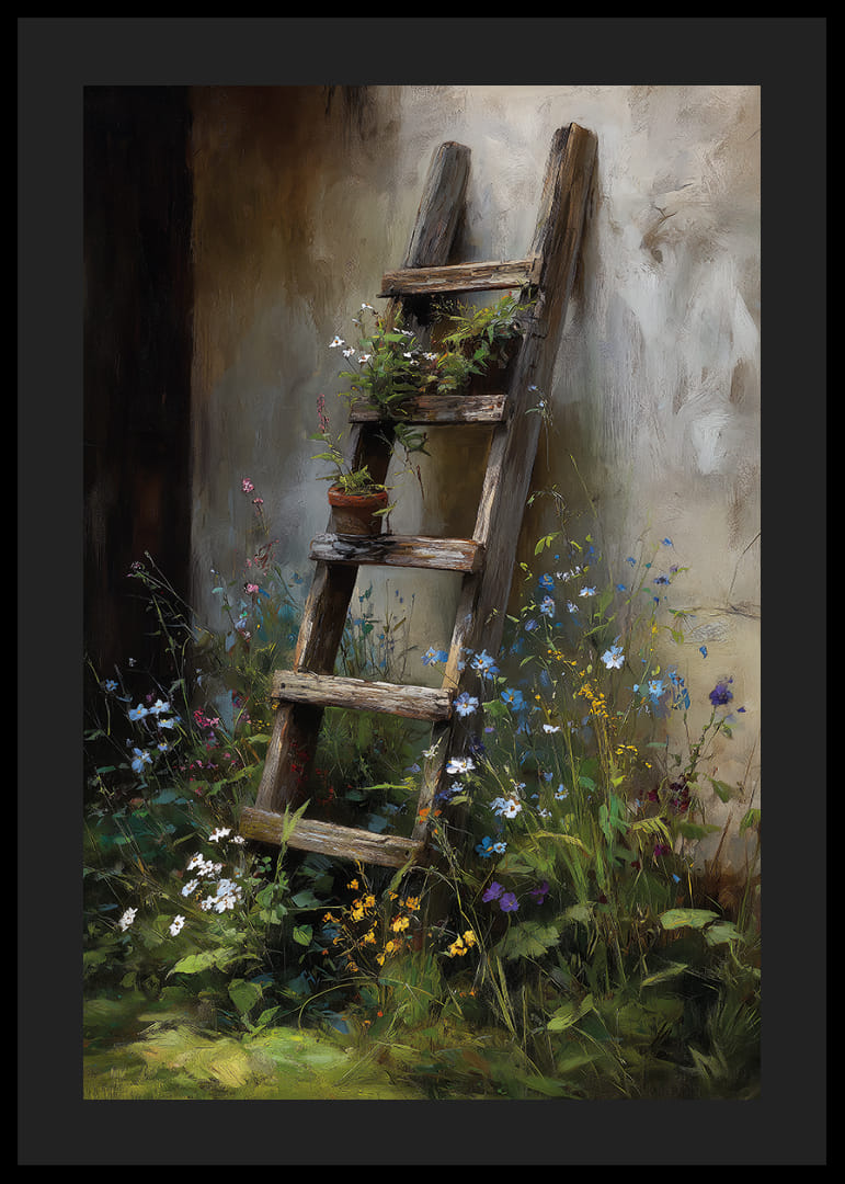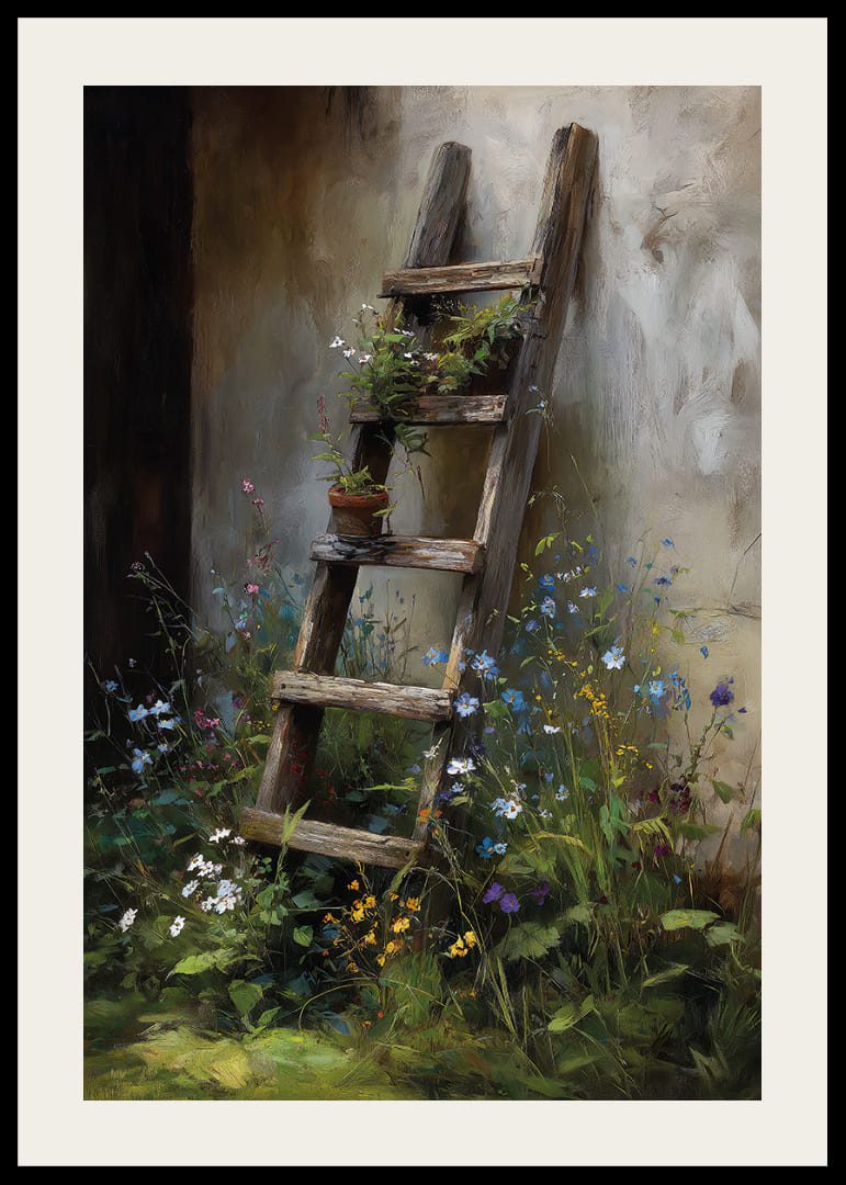 Denne plakat forestiller et magisk sceneri med en gammel træstige, der læner sig op ad en væg, dækket af vilde blomster i forskellige nuancer. Blomsterne danser livligt rundt på trinnene og skaber en charmerende kontrast mellem naturens skønhed og de slidte træplanker. Plakatens naturlige skønhed og harmoniske farver skaber en følelse af fred og tidløshed, der kan løfte stemningen i enhver boligindretning.