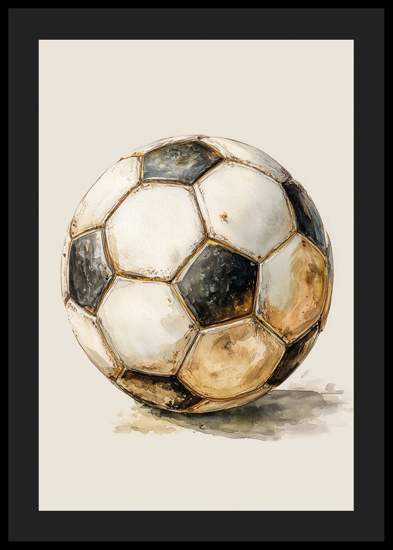 Denne plakat indfanger essensen af ​​gamle fodboldkampe med en slidt bold, hvis gyldne nuancer afspejler tidens gang. Hver nuance og slid minder om utallige kampe, der har berørt mange generationer. Plakaten skaber et nostalgisk præg i dit hjem, hvor dens historiske charme og varme forvandler ethvert rum til en hyldest til spillets tidløse skønhed.