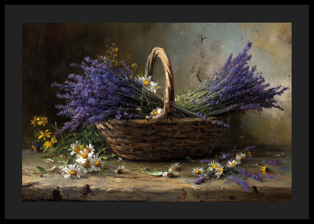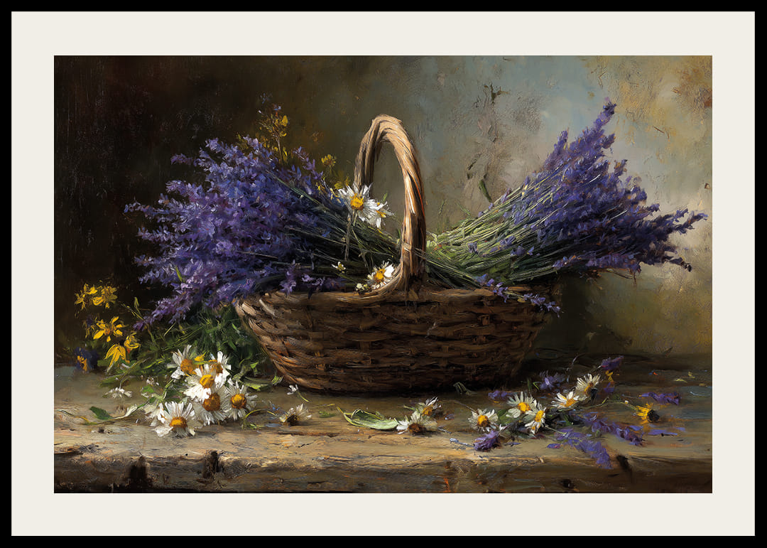 Denne plakat formidler en harmonisk og rustik stemning med sin smukke kurv fyldt med lilla lavendel og hvide margueritter. Den blide farvepalet af blå og hvid blander sig sammen for at skabe en følelse af ro og enkelhed. Placeringen af ​​blomsterne giver et strejf af vild skønhed, der naturligt komplementerer ethvert rum. Plakaten vil være en perfekt del af interiøret og forbedre atmosfæren med sin bløde tilstedeværelse.