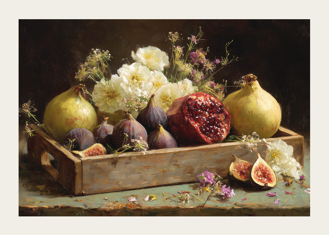 Denne plakat fanger straks øjet med sin overflod af fyldige, naturlige toner og et stilleben af ​​frugter og blomster. Nuancerigdommen og detaljernes skarphed skaber en følelse af efterårsro og overflod. Sarte blomster og saftige figner spiller sammen i perfekt harmoni. Plakaten tilføjer varme og elegance til dit hjem og forbedrer rummets atmosfære med sin indbydende og tidløse skønhed.