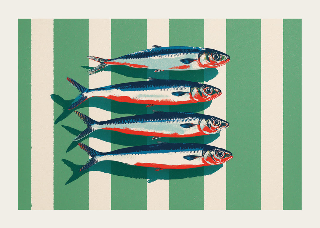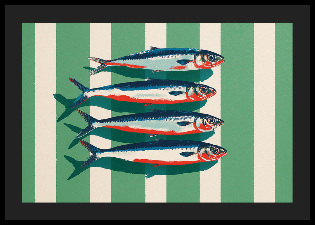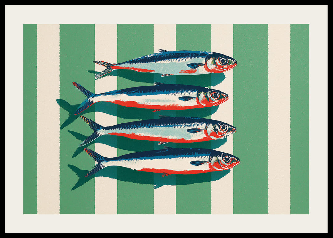 Fire livlige sardiner i klare farver står i kontrast til en baggrund af grønne og hvide striber, hvilket giver plakaten et dristigt og moderne præg. Farverne blå, rød og grøn danser i harmoni og indfanger havets livlighed. Dette kunstværk vil bringe energi og kreativitet til ethvert rum, hvor plakaten vil blive et fokuspunkt, der oplyser og betager med sin stilfulde enkelhed og havinspirerede eventyr.