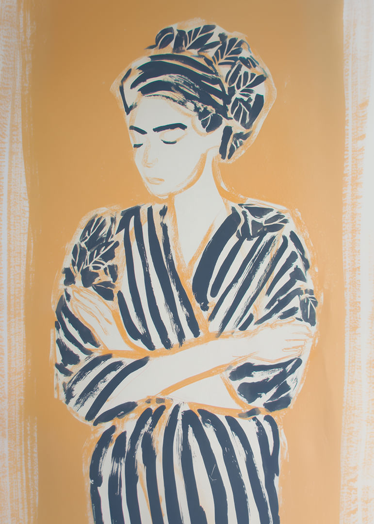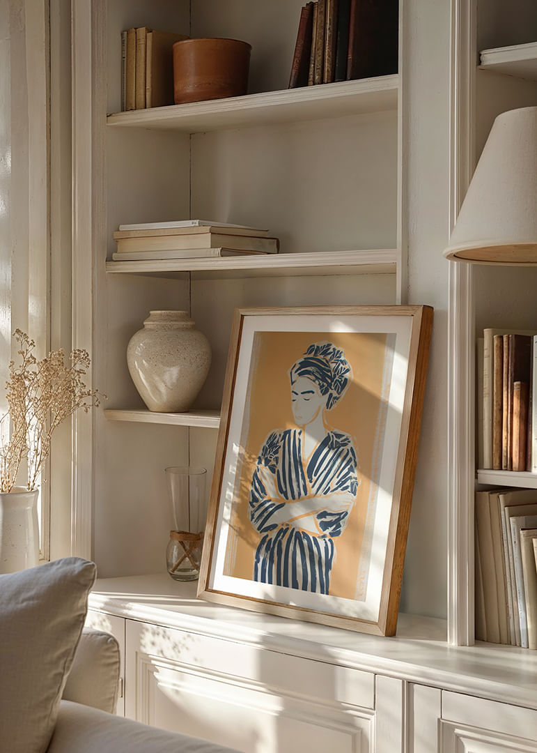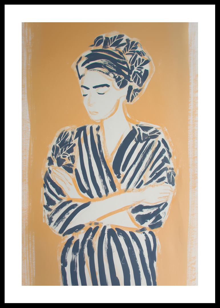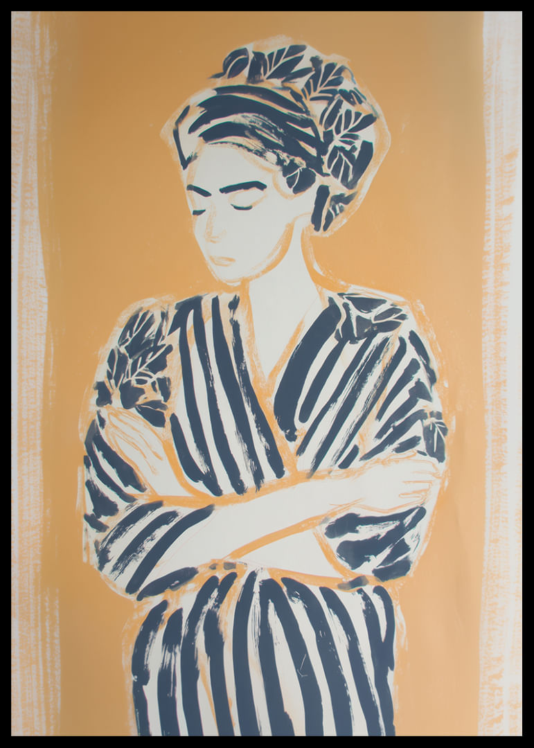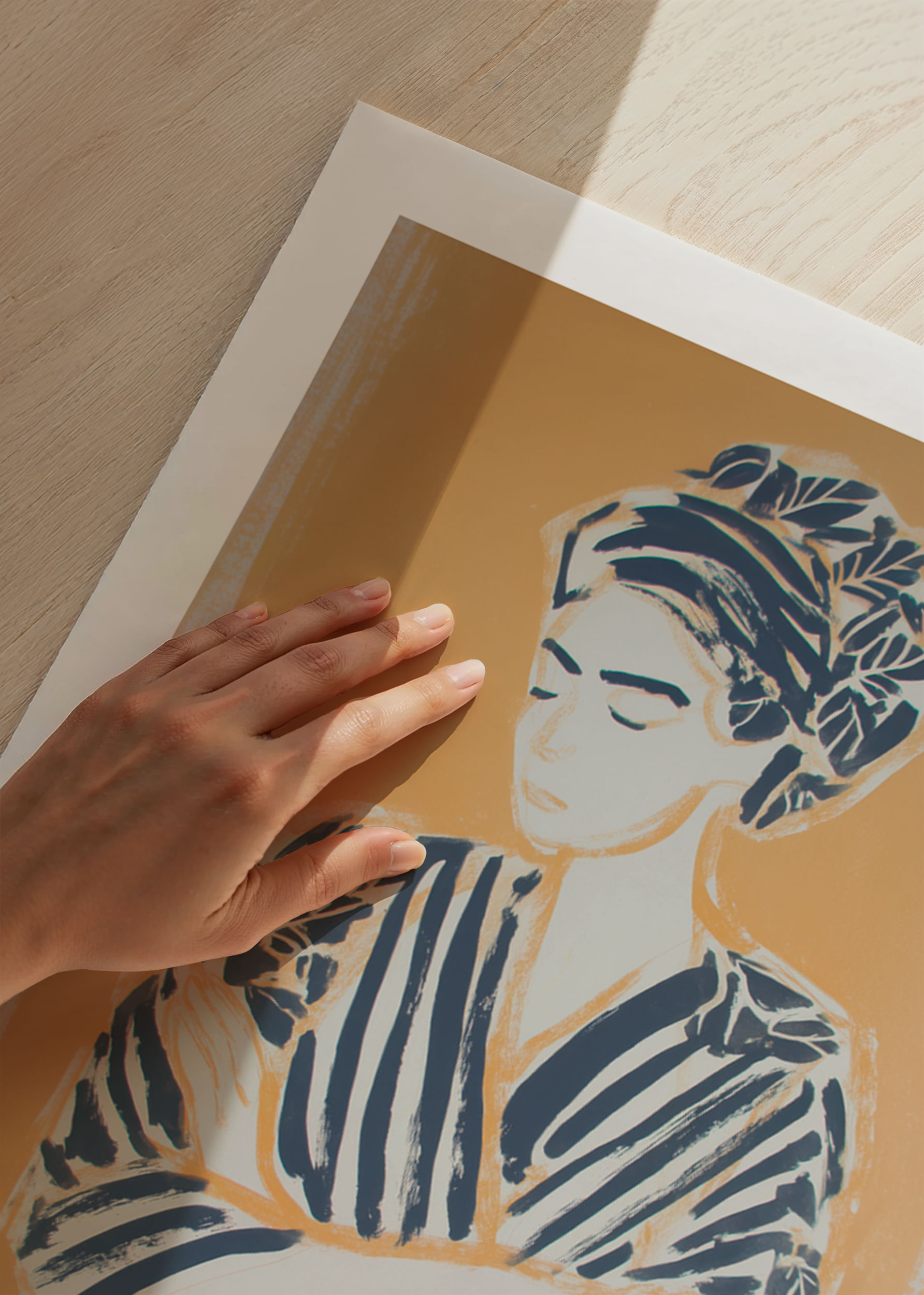 Skab ro med denne plakat af en kvinde pakket ind i afslappede linjer i varme, gyldne toner. Hendes lukkede øjne og bløde udtryk fremkalder en fredfyldt ro, mens de dristige linjer i hendes påklædning skaber en følelse af styrke midt i stilheden. Denne plakat forvandler dit rum med en subtil balance mellem kraft og fred og skaber et sted for meditation og refleksion.