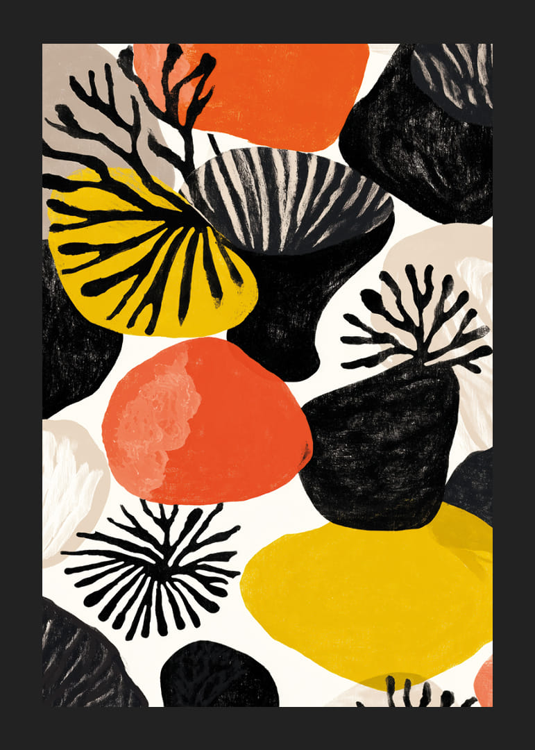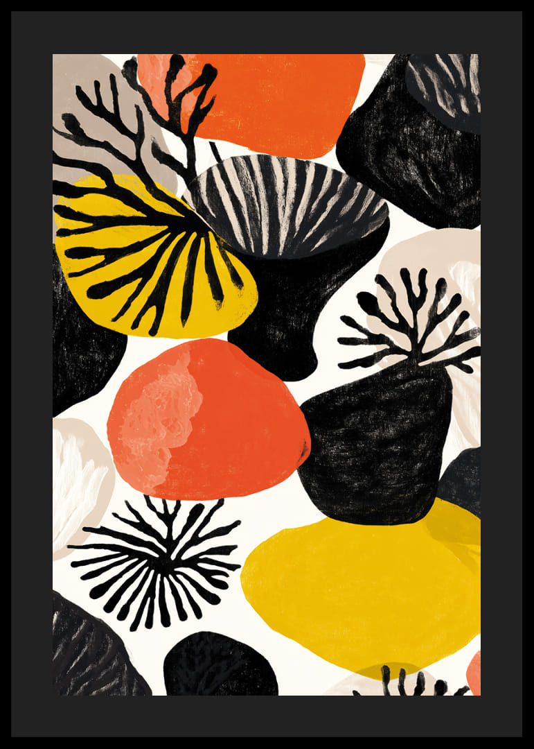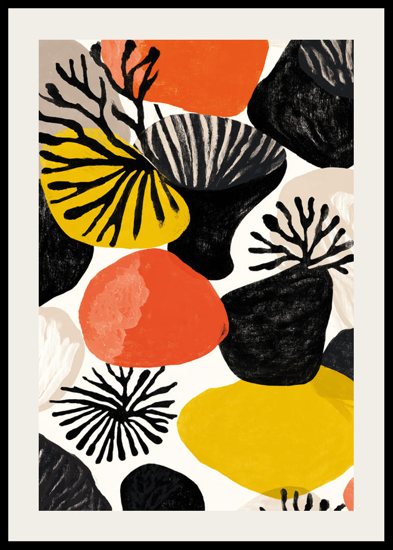 En eksplosion af farver og former fanger øjet på denne plakat med dens dristige, organiske mønstre. De strålende nuancer af rød, gul og sort danser hen over overfladen og skaber en dynamisk og levende atmosfære. Plakaten giver en følelse af moderne kunst med sine abstrakte botaniske motiver og er perfekt til at fremhæve energien og stilen i ethvert rum.