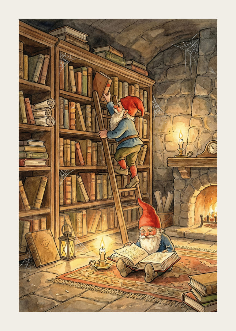 På denne plakat finder vi to nisser fordybet i bøgernes verden, omgivet af en varm og indbydende atmosfære. Lyset fra stearinlys og en knitrende ild kaster bløde skygger hen over stenmurene. Den ene nisse står på trappen, mens den anden sidder komfortabelt på gulvet og læser. Denne plakat forvandler ethvert rum til et sted med magiske eventyr og litterær nydelse.