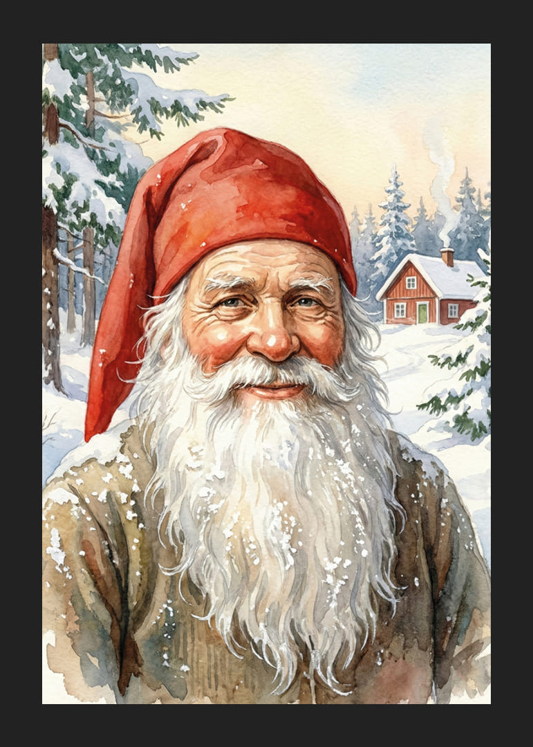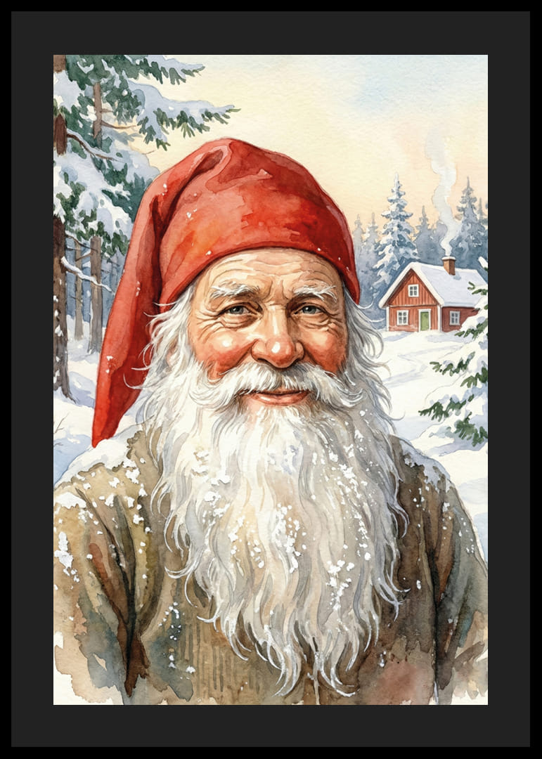 Denne plakat forestiller en venlig julemand i et smukt snedækket landskab. Med en Rødhætte og et stort smil udstråler han en varm følelse midt i den kolde vinter. De snedækkede træer og det lille hus i baggrunden skaber en magisk atmosfære. Denne fantastiske plakat ville forvandle ethvert rum til en vinteroase fyldt med glæde og fred, perfekt til at skabe en indbydende atmosfære.