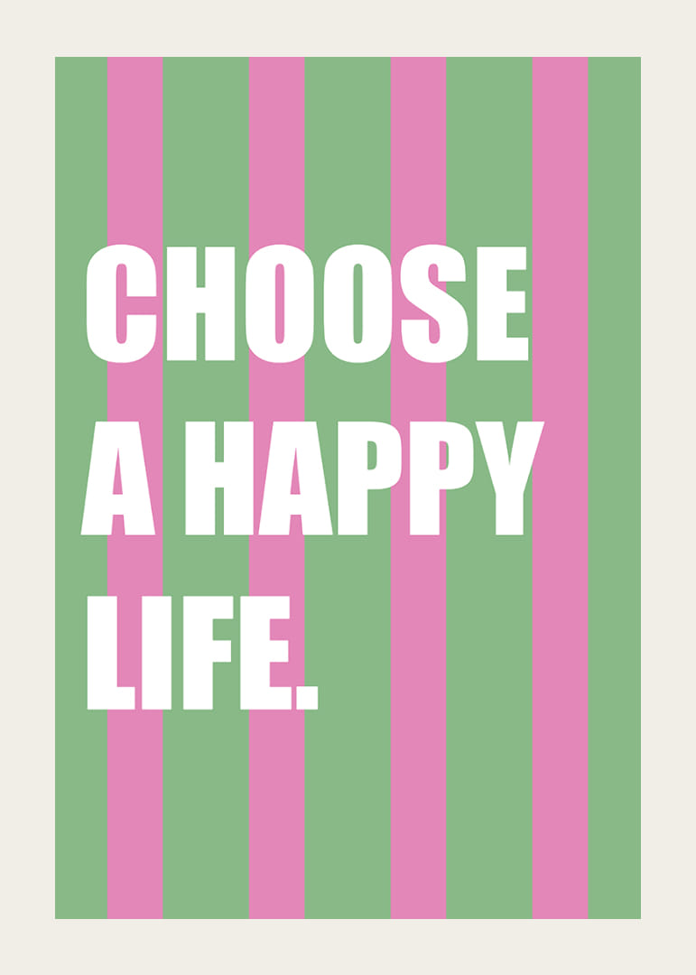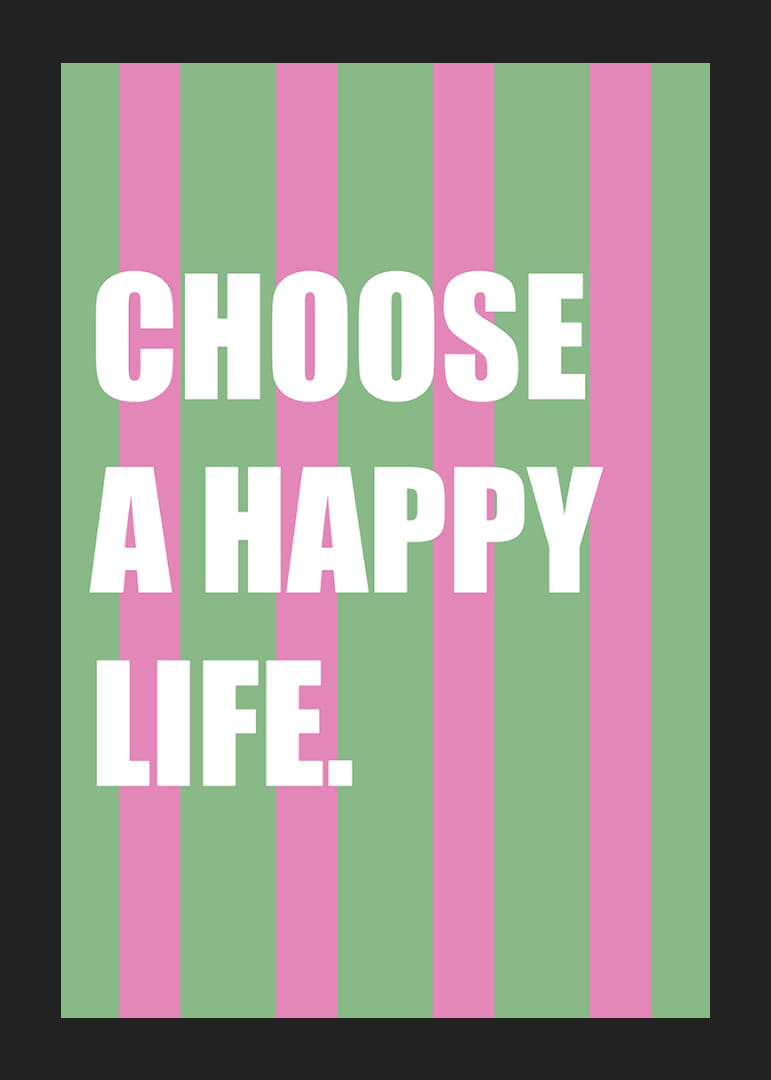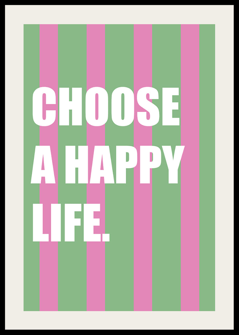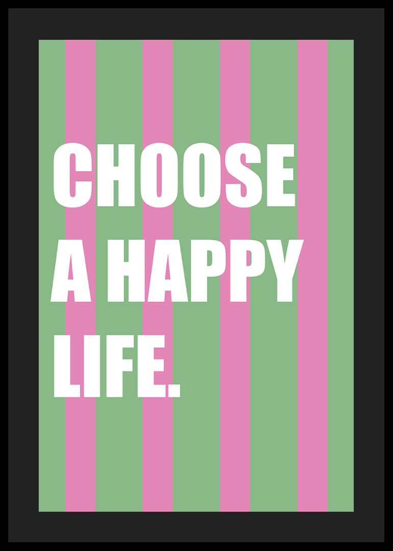 Med sine livlige lyserøde og grønne striber inspirerer denne plakat til glæde og positivitet. De stærke farver kombineret med det opløftende budskab skaber en kraftfuld atmosfære, der opfordrer til refleksion og velvære. At have denne plakat i dit hjem bringer en følelse af optimisme og energi og minder os om at vælge lykken hver dag.