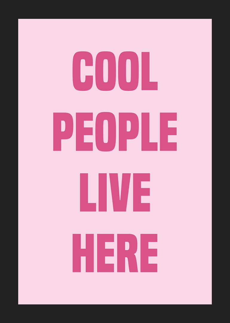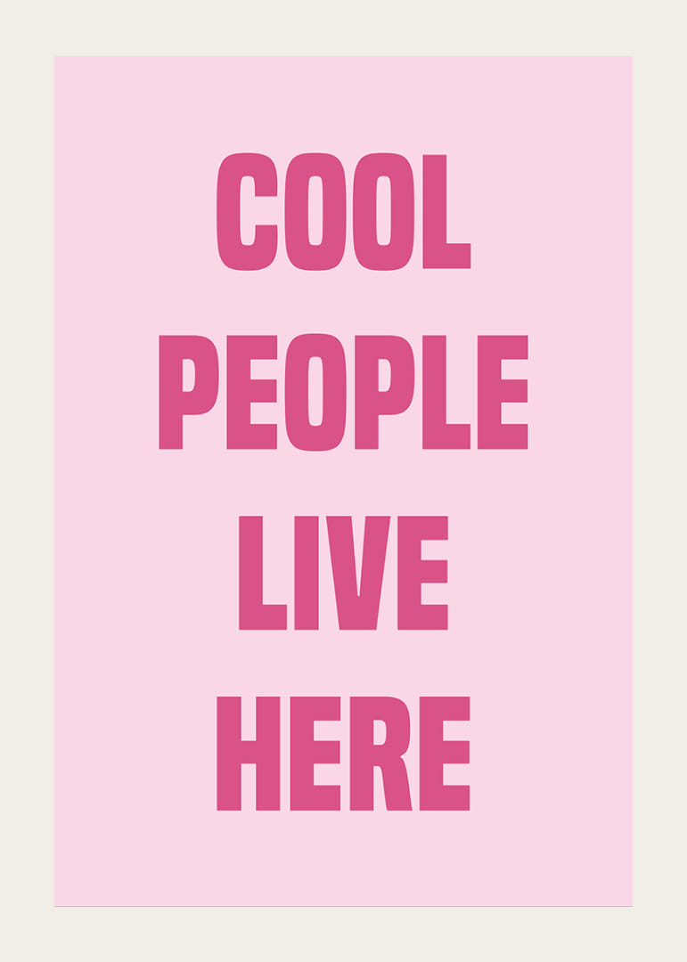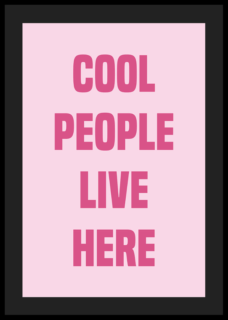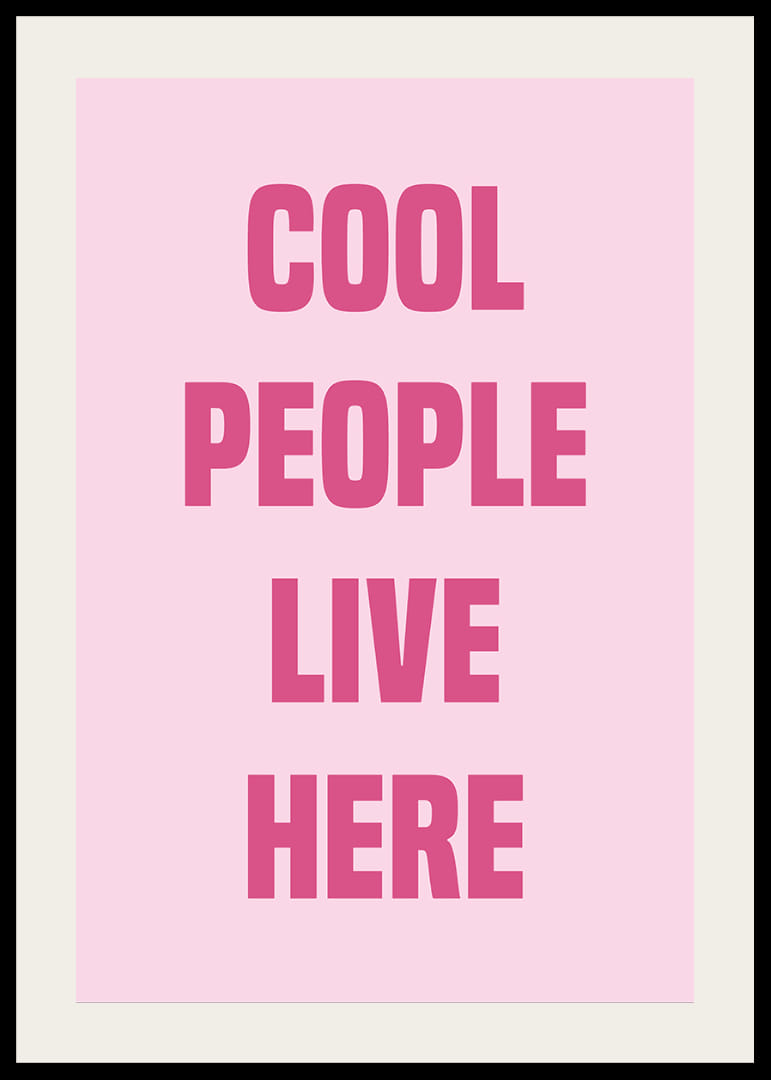 Denne plakat udstråler selvtillid og stil med sine dristige lyserøde bogstaver mod en blød baggrund. Ordene "Cool People Live Here" skaber en moderne og indbydende atmosfære, der ville være perfekt til en trendy stue eller soveværelse. Plakaten vil forvandle ethvert rum til et udtryk for individualitet og urban elegance og tilføje et strejf af sofistikering og legesyge til dit hjem.