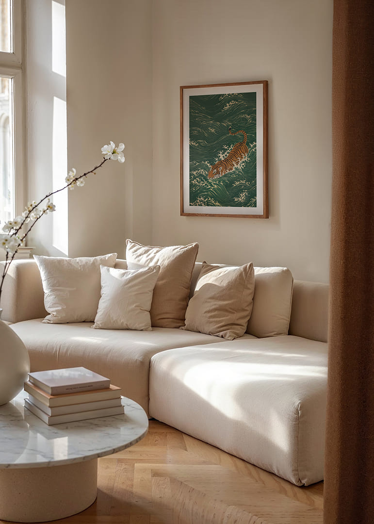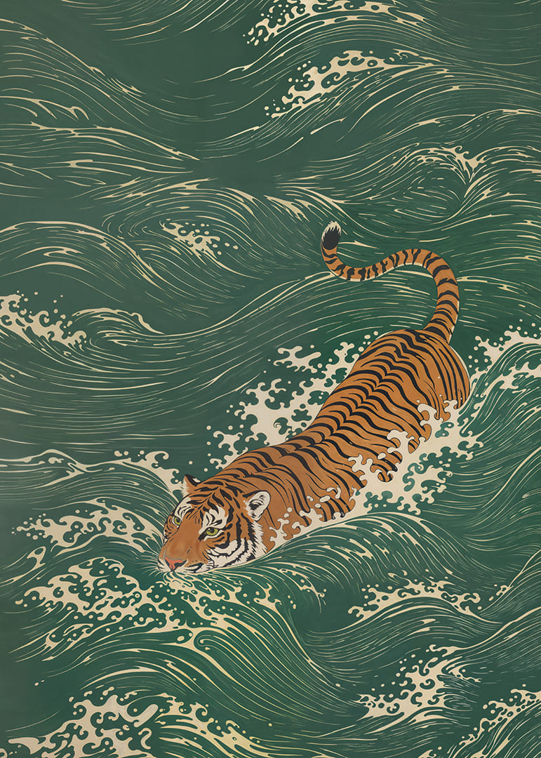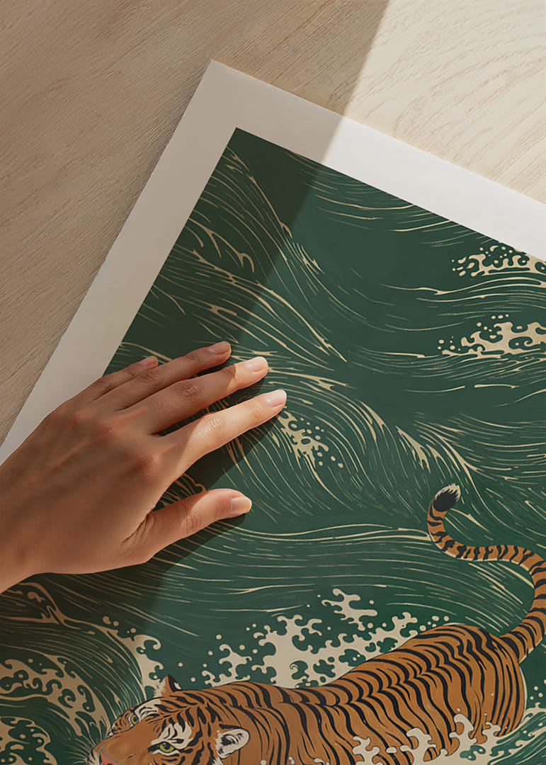 Denne plakat forestiller en tiger, der yndefuldt bryder gennem rullende grønne bølger og skaber en følelse af elegant styrke. Det livlige samspil mellem rovdyrets markante striber og havets bløde former fremhæver en fantastisk harmoni. Denne plakat er perfekt til at tilføje et strejf af vild skønhed og dynamik og bringer en følelse af både ro og styrke til ethvert rum.
