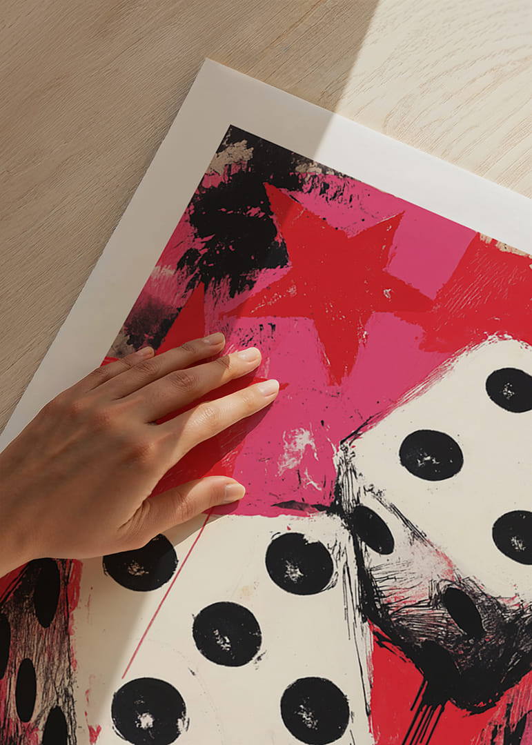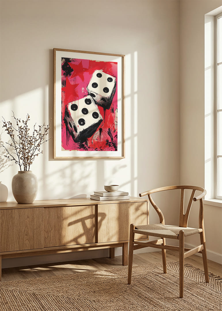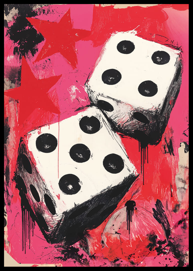 Plakaten fanger øjet med sine livlige farver og to store terninger, der næsten ser ud til at rulle af overfladen. Den markante røde baggrund skaber en følelse af bevægelse og energi, mens stjernerne tilføjer et kosmisk præg. Denne plakat forvandler ethvert rum til et sted fyldt med tilfældigheder og glæde og bringer en moderne og legende atmosfære til dit hjem.