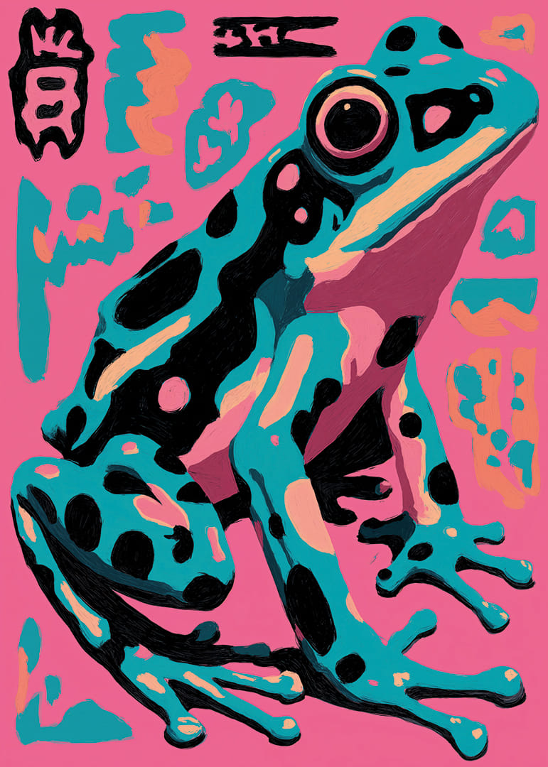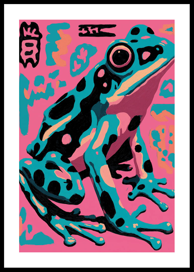 Denne plakat fanger øjet med sin farverige frø i pop art-stil, hvor stærke kontraster mellem turkis, pink og sort skaber en levende atmosfære. Den legende tegnede frø tilføjer både dybde og bevægelse og bringer enhver væg til live. Med sin energi og livlige farvepalet vil denne plakat være en fantastisk tilføjelse, der vil forvandle dit hjem til en levende og unik kunstudstilling.