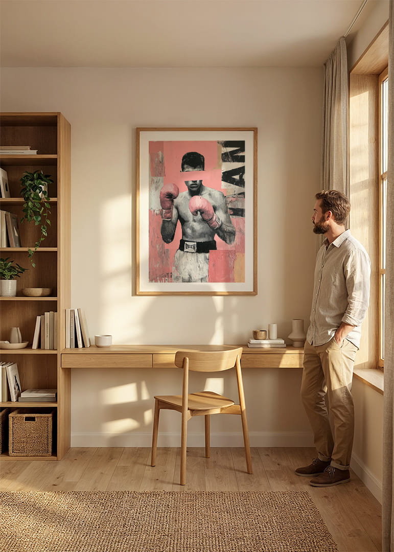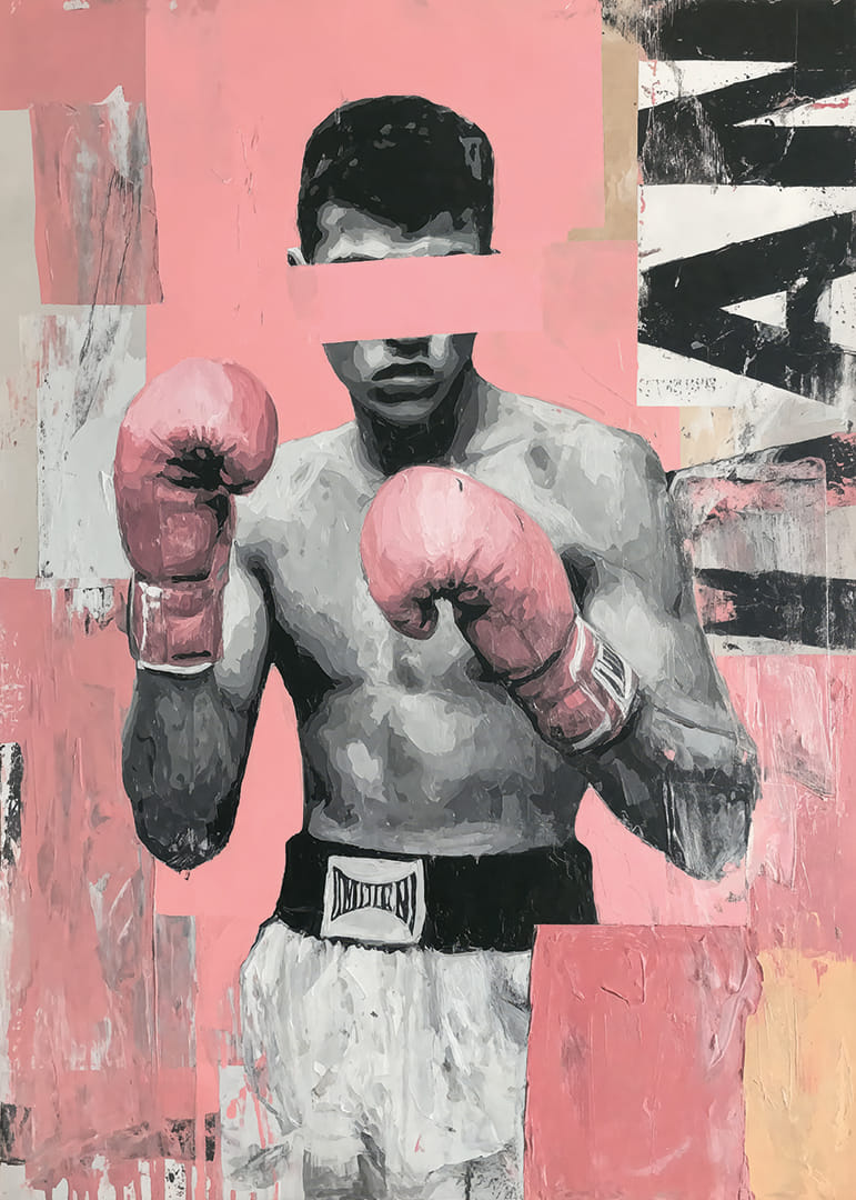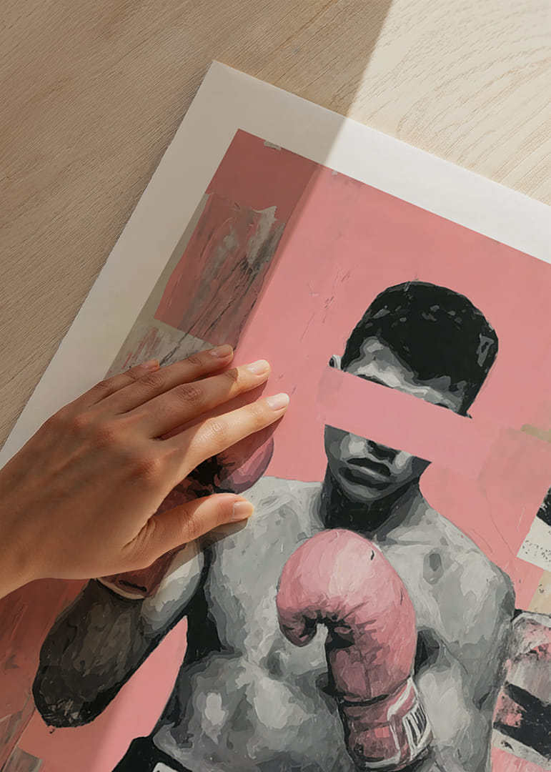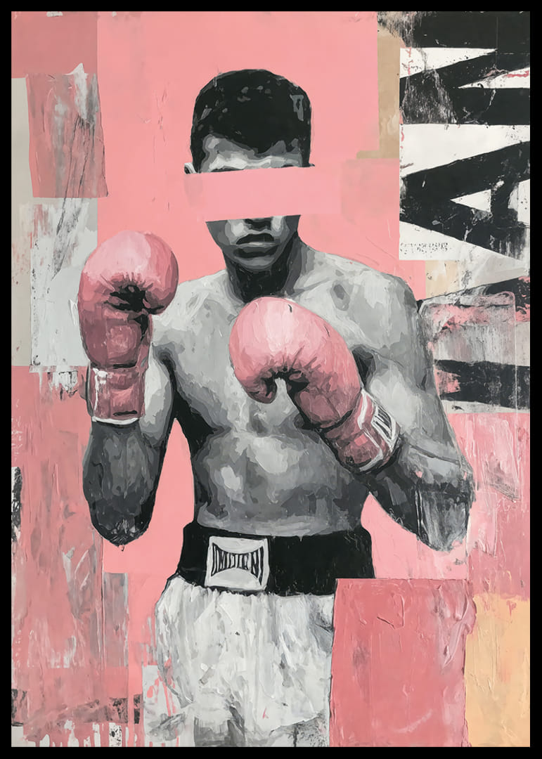 Denne plakat forestiller en kraftfuld bokser i en klassisk positur med lyserøde handsker i kontrast til en blød baggrund. De energiske penselstrøg og den dynamiske komposition giver værket et levende udtryk. Plakaten formidler en følelse af styrke og beslutsomhed, hvilket gør den til et centralt og inspirerende element i ethvert rum.