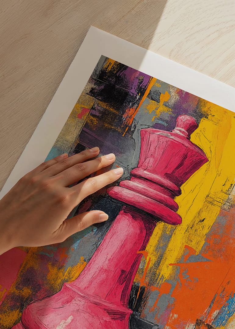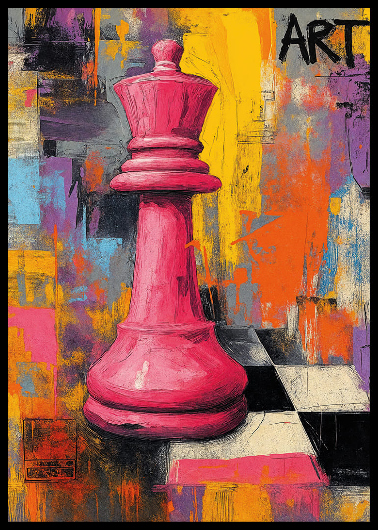 Denne plakat fanger straks øjet med en majestætisk skakbrik i midten, omgivet af en eksplosion af livlige farver. De dristige penselstrøg i pink, orange og lilla skaber en dynamisk følelse af energi og strategisk tænkning. Plakaten udstråler kreativitet og tilføjer et sofistikeret præg til ethvert rum. Gennem sit unikke design forvandler den atmosfæren til et kunstværk af farver og form.