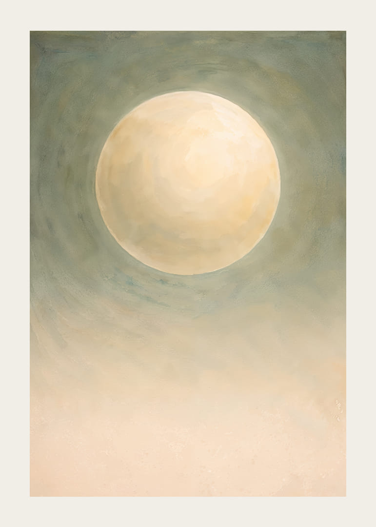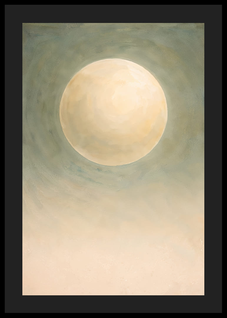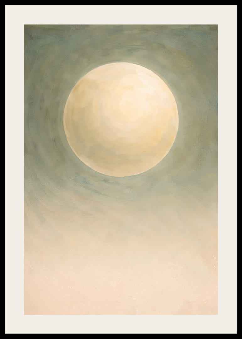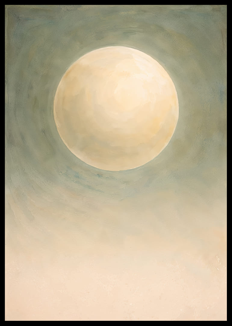 Denne plakat indfanger en næsten magisk atmosfære, hvor en stor, blødt glødende måne svæver i et tåget grønt landskab. Den blide glød skaber en følelse af fred og ro, der omfavner rummet. Farvetonerne er subtile og elegante, hvilket gør plakaten til en tidløs dekoration. Den forvandler ethvert rum til en oase af ro og refleksion, hvor besøgende kan føle sig inspirerede og i fred.