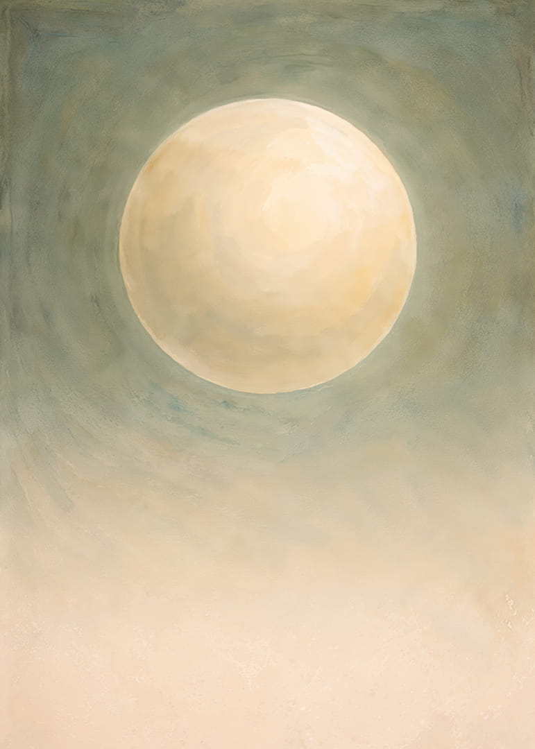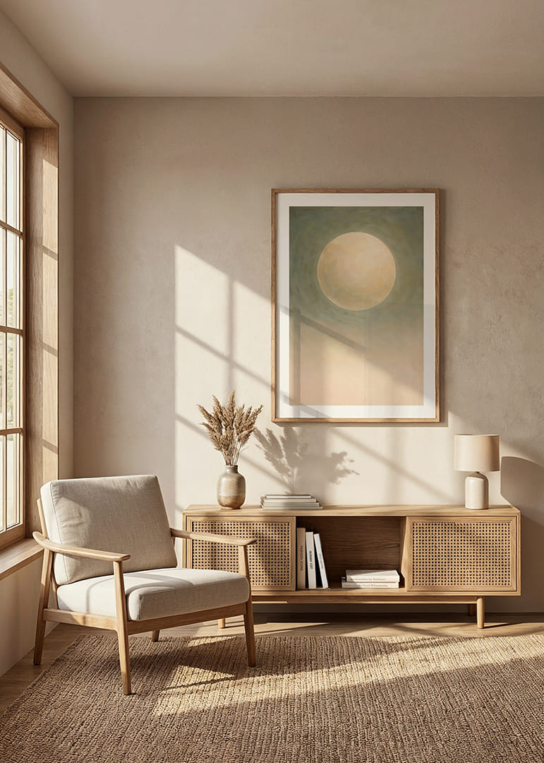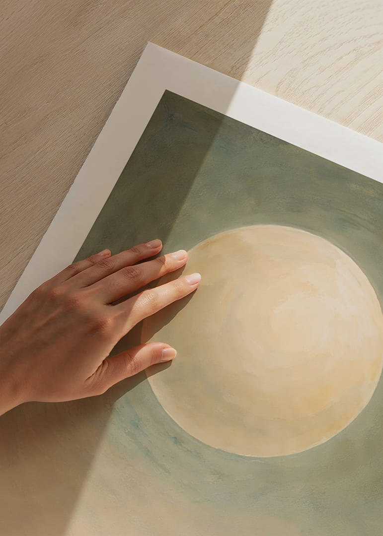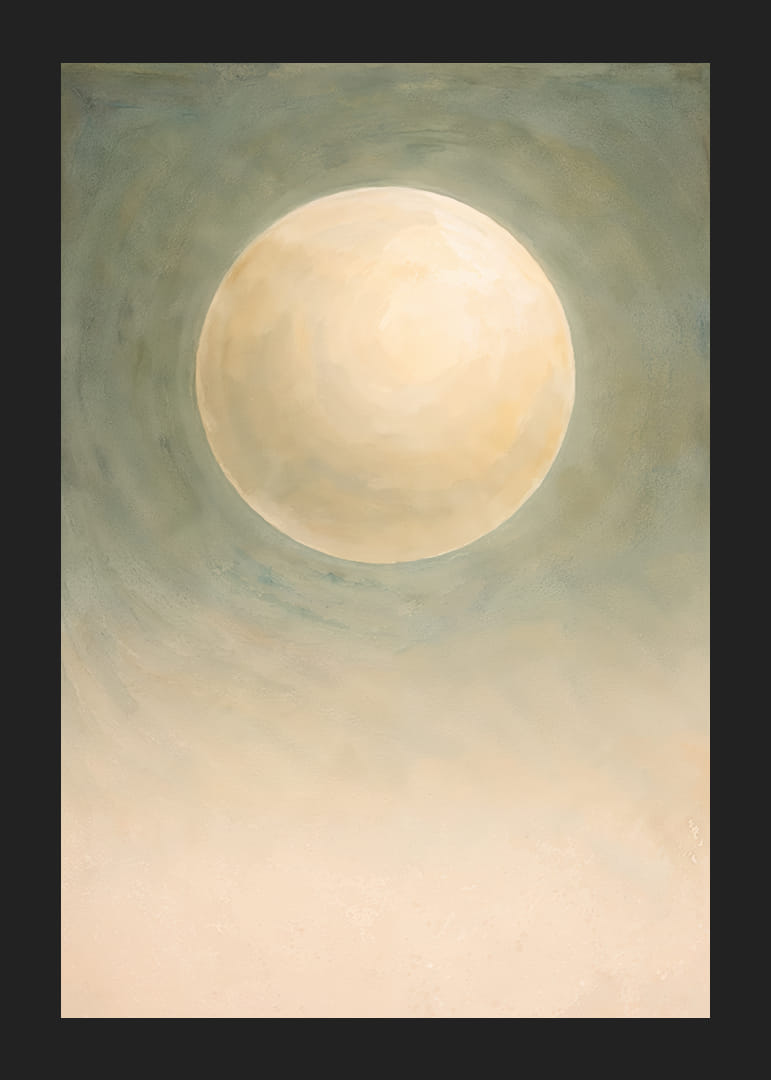 Denne plakat indfanger en næsten magisk atmosfære, hvor en stor, blødt glødende måne svæver i et tåget grønt landskab. Den blide glød skaber en følelse af fred og ro, der omfavner rummet. Farvetonerne er subtile og elegante, hvilket gør plakaten til en tidløs dekoration. Den forvandler ethvert rum til en oase af ro og refleksion, hvor besøgende kan føle sig inspirerede og i fred.