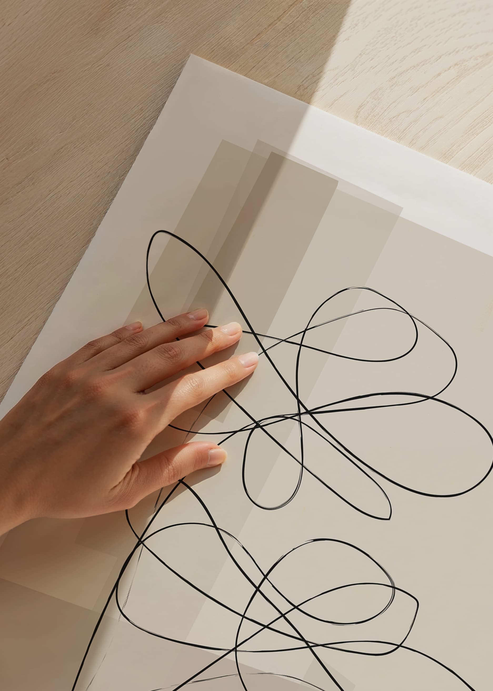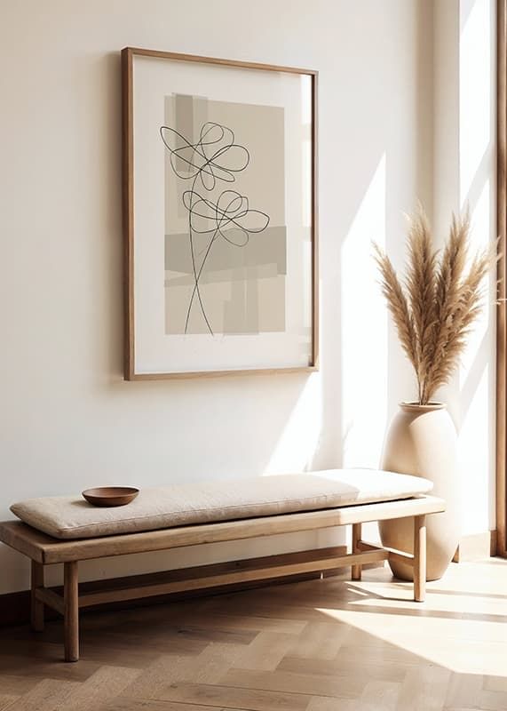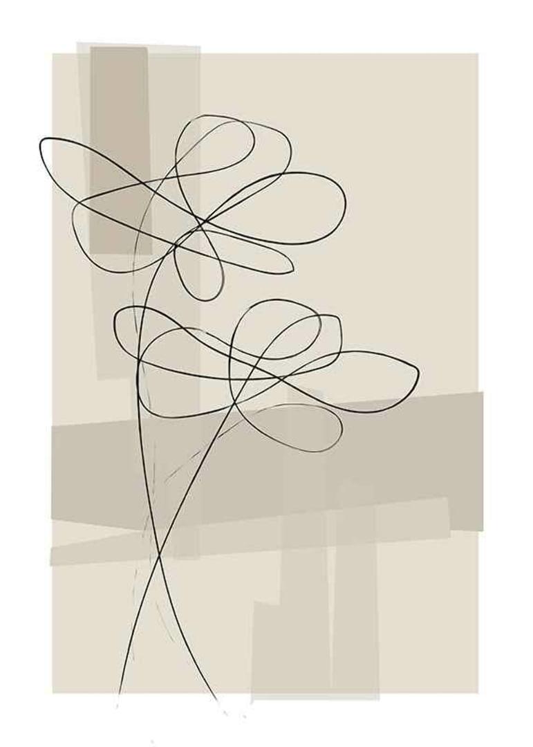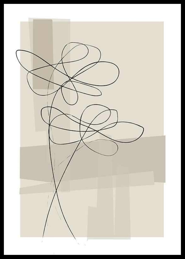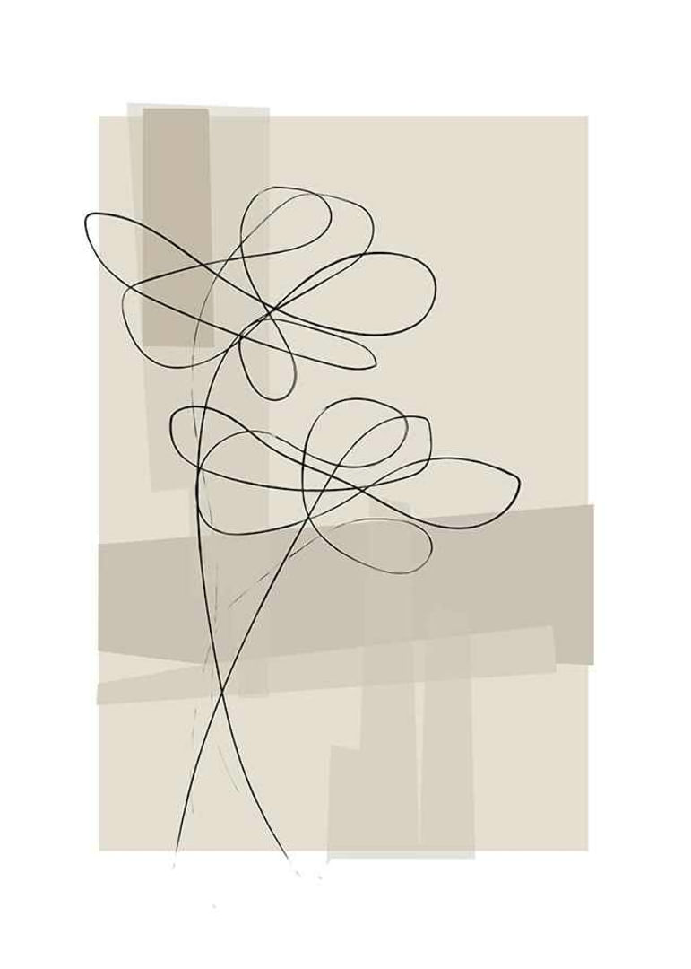 Plakat med linje kunst illustrationer af blomster mod en abstrakt baggrund i beige og brune toner.