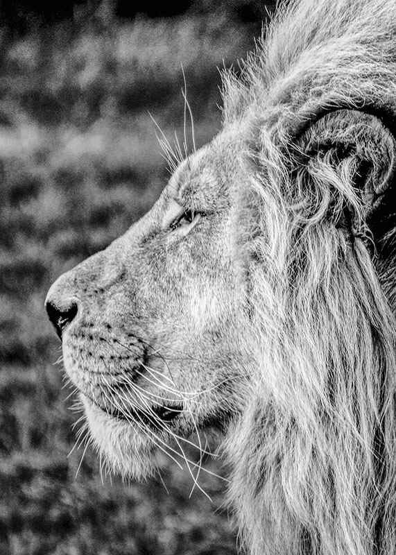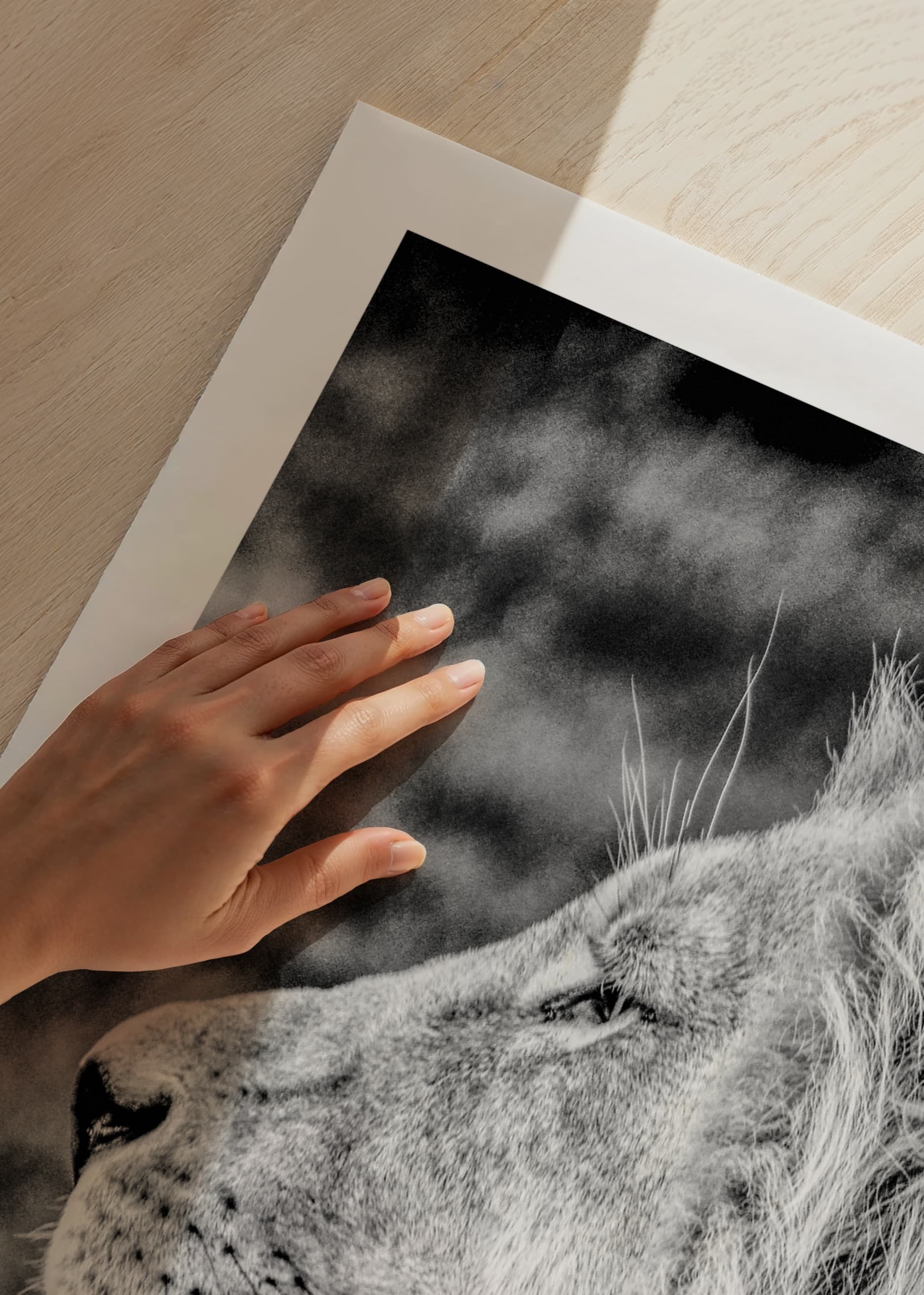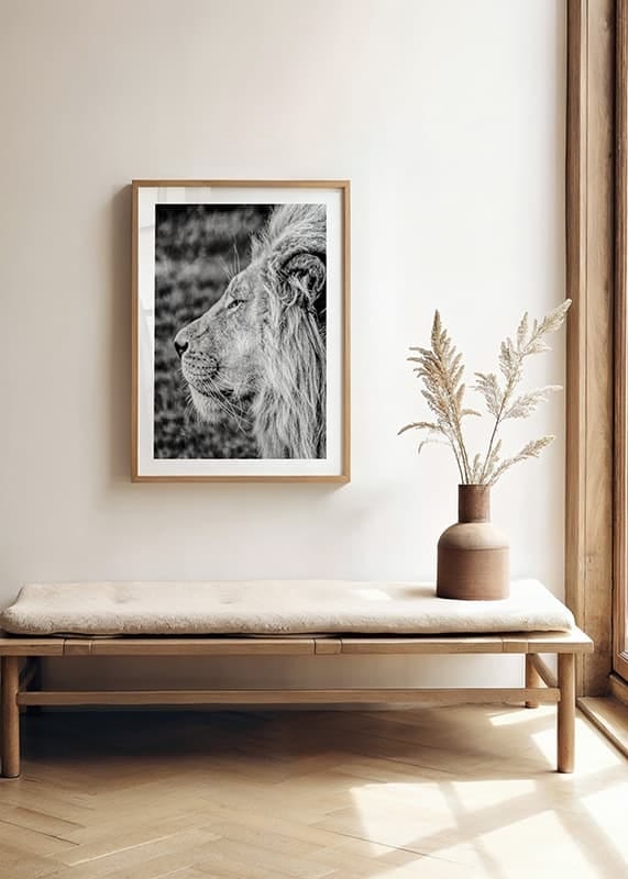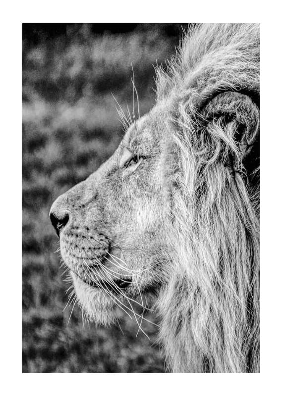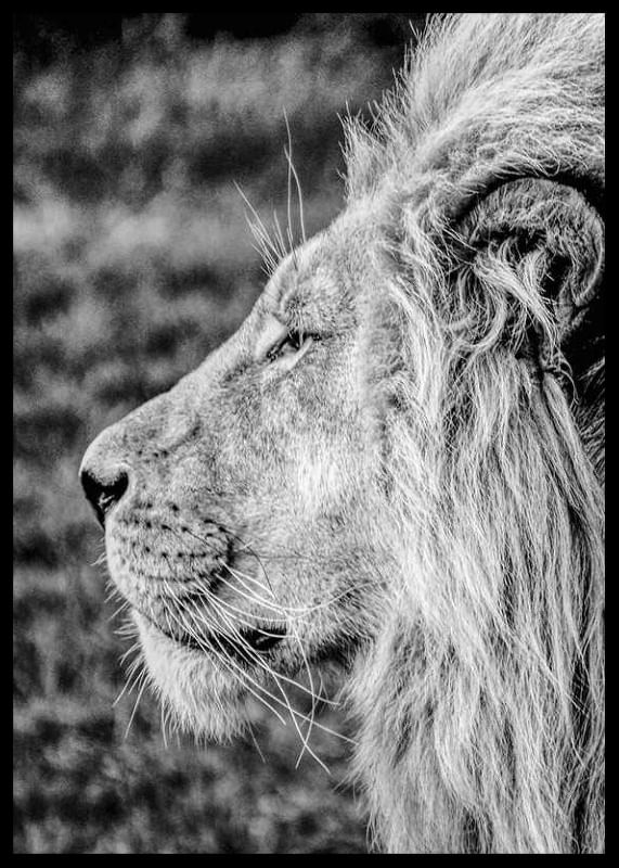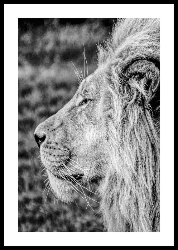 Et nærbillede af en hanløve i profil med en kraftig man og mejslede ansigtstræk dominerer motivet. Det sort-hvide farveskema fremhæver pelsens tekstur og giver et tidløst og stilfuldt præg. Denne plakat er velegnet til både moderne stuer og arbejdsrum, hvor du ønsker at tilføje en karakteristisk og kraftfuld detalje.