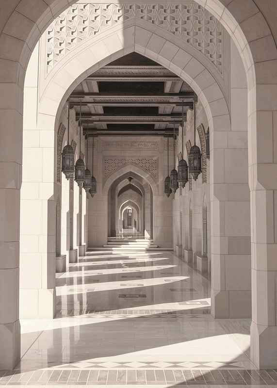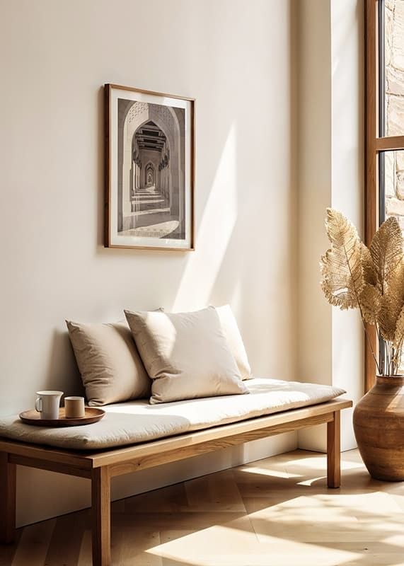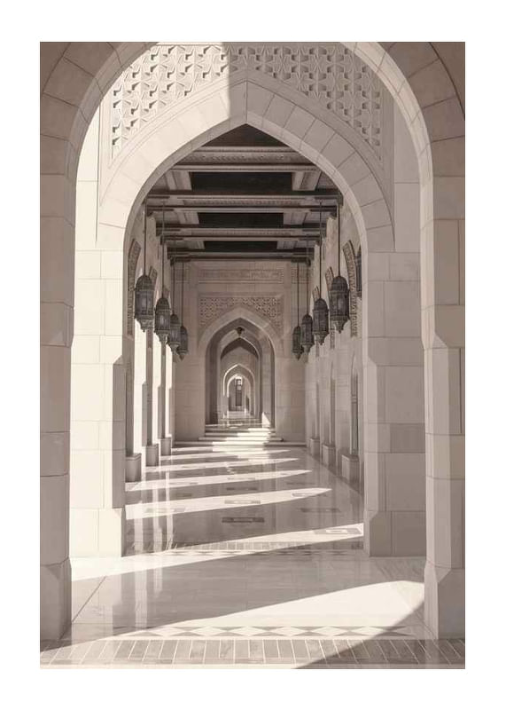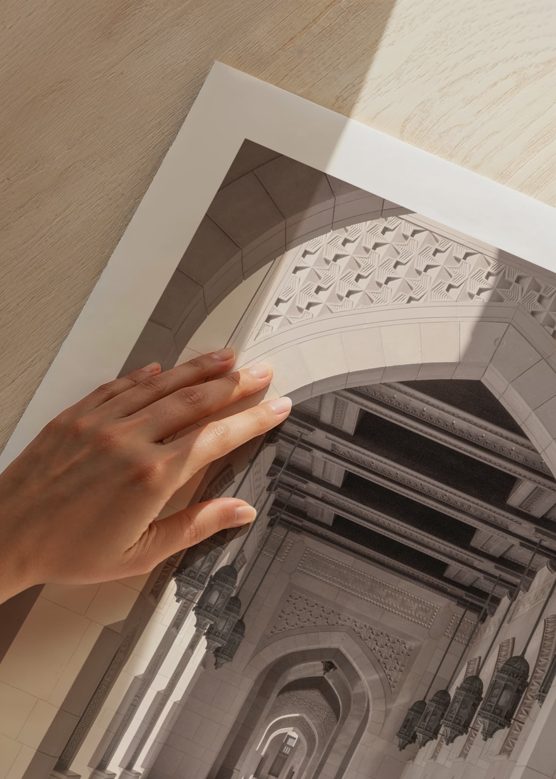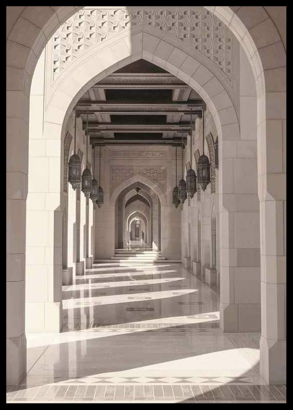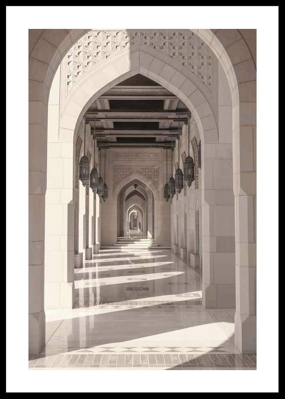 Arkitektonisk plakat, der viser en klosterinspireret arkade med gentagne buer og dekorative mønstre. Lyset spildes over det skinnende gulv og skaber et harmonisk skyggespil. Det varme beige og svagt røde farveskema giver et tidløst udtryk. Velegnet til rum, hvor ro og symmetri ønskes, og komplementerer moderne indretning.