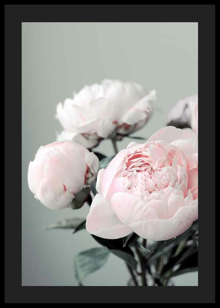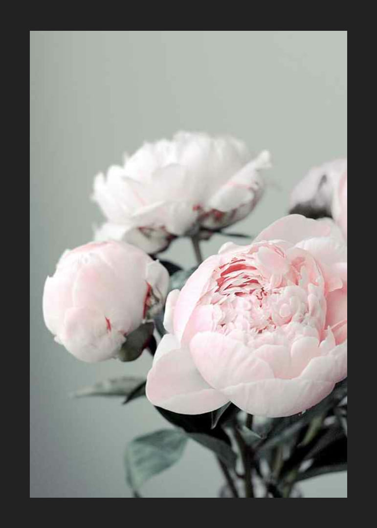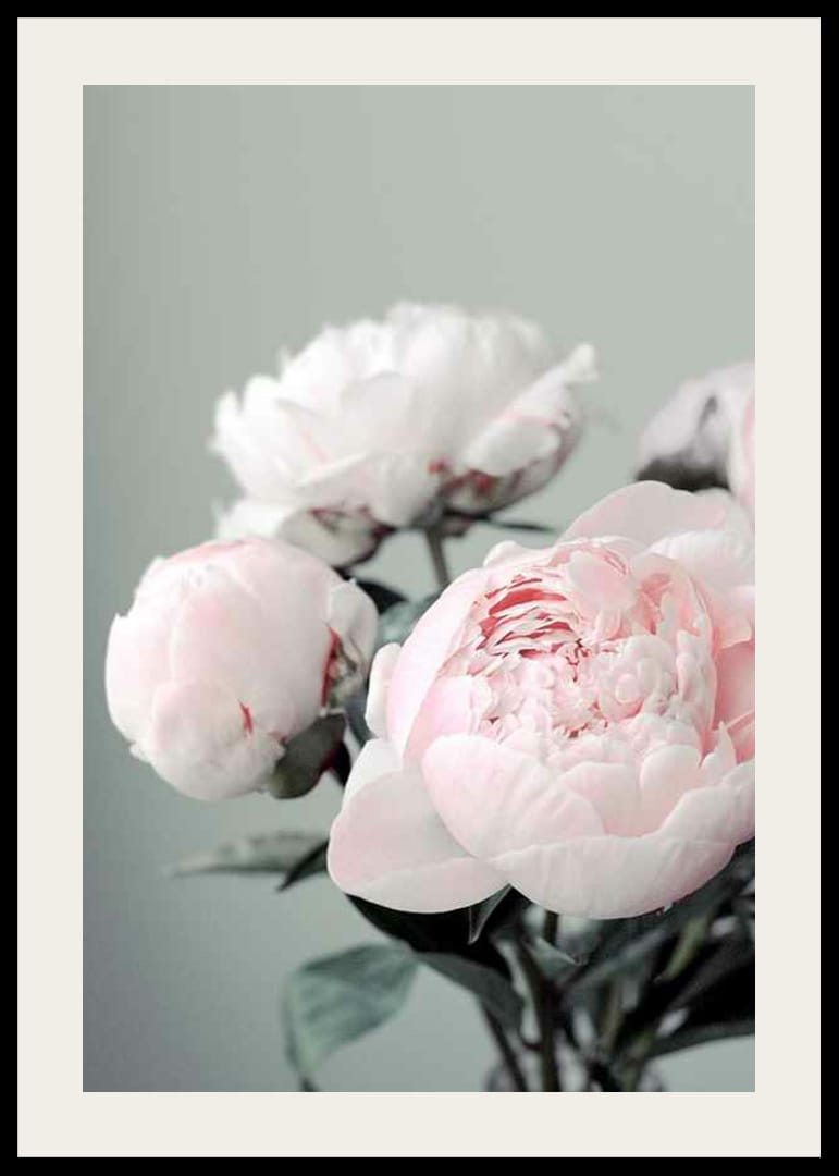 Nærbillede af pæoner i bløde, lyserøde nuancer, hvor blomsterne åbner sig mod en svag grøn baggrund. De silkeagtige kronblade har diskrete nuancer og skaber et roligt og friskt udtryk. Med sit tidløse præg passer denne plakat ind i både soveværelser og stuer og giver en lys og forårsagtig atmosfære til rummet.