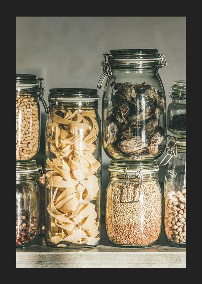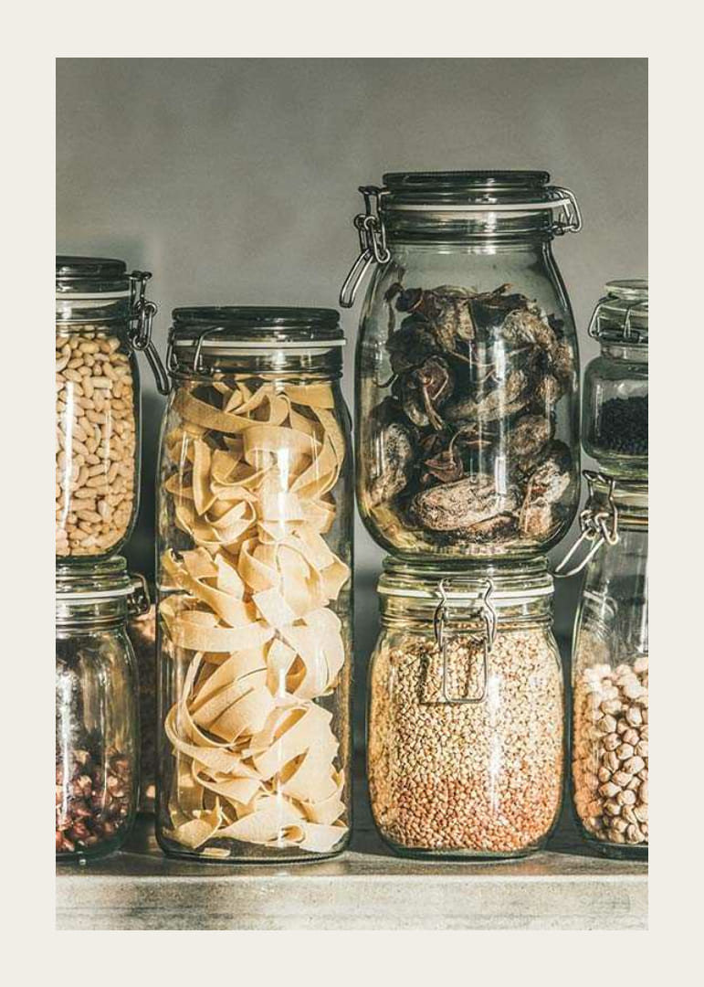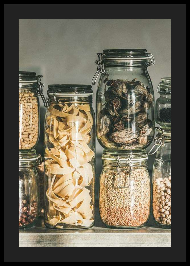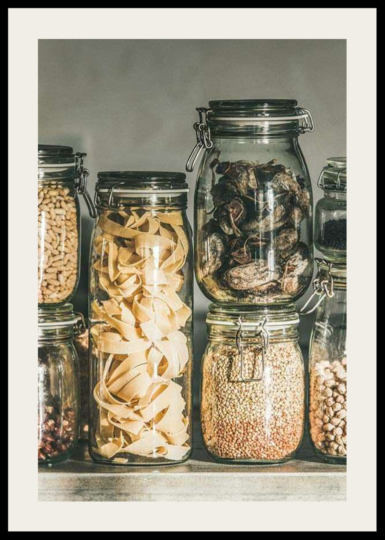 Forskellige typer pasta, nødder, frø og tørrede grøntsager er udstillet i stablede glaskrukker med låg langs en hylde mod en neutral baggrund. Naturlige beige og brune nuancer skaber et organiseret look. Denne plakat giver køkkenet en harmonisk og velorganiseret fornemmelse med fokus på klassisk madopbevaring.