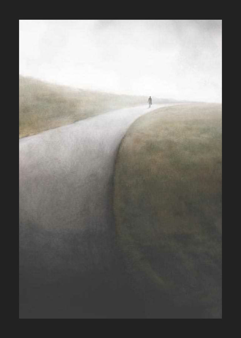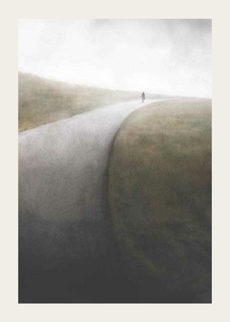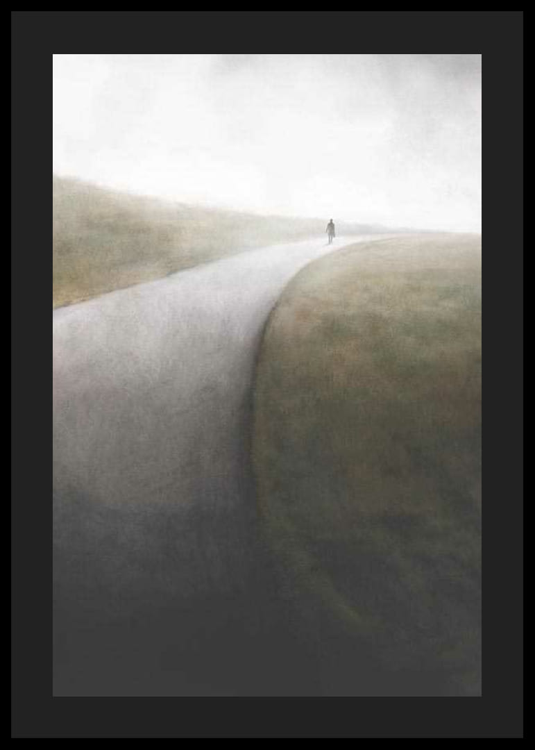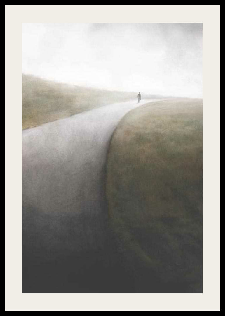En ensom person går på en snoet landevej, der forsvinder ind i et tåget og goldt landskab. Bløde, afdæmpede toner af grå og beige skaber en rolig følelse, hvor vej og mark smelter sammen. Med sit afskallede udtryk giver denne plakat rummet en afdæmpet og reflekterende atmosfære, især om efteråret.