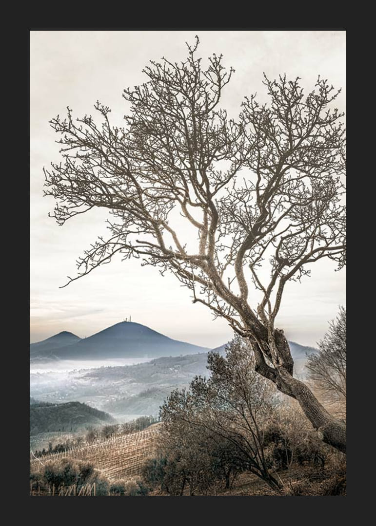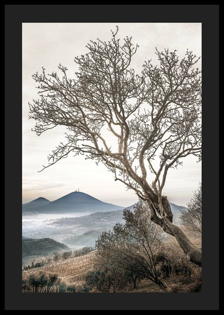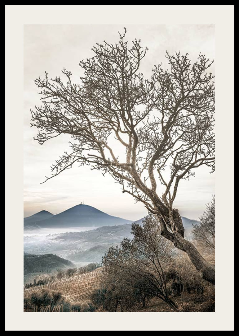 Et bart træ med snoede grene strækker sig ud mod en diset, lys himmel. I baggrunden ses bølgende efterårslandskaber og fjerne bjerge indhyllet i tynd tåge. Jordfarver og blødt lys giver plakaten en rolig karakter, der passer godt ind i rum, hvor en følelse af natur og vidstrakthed ønskes.