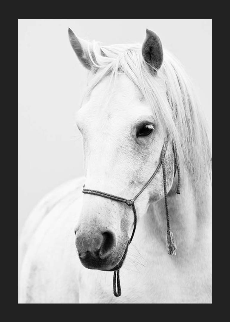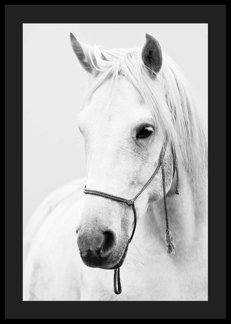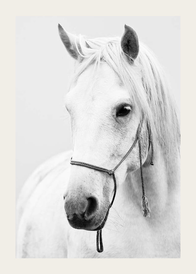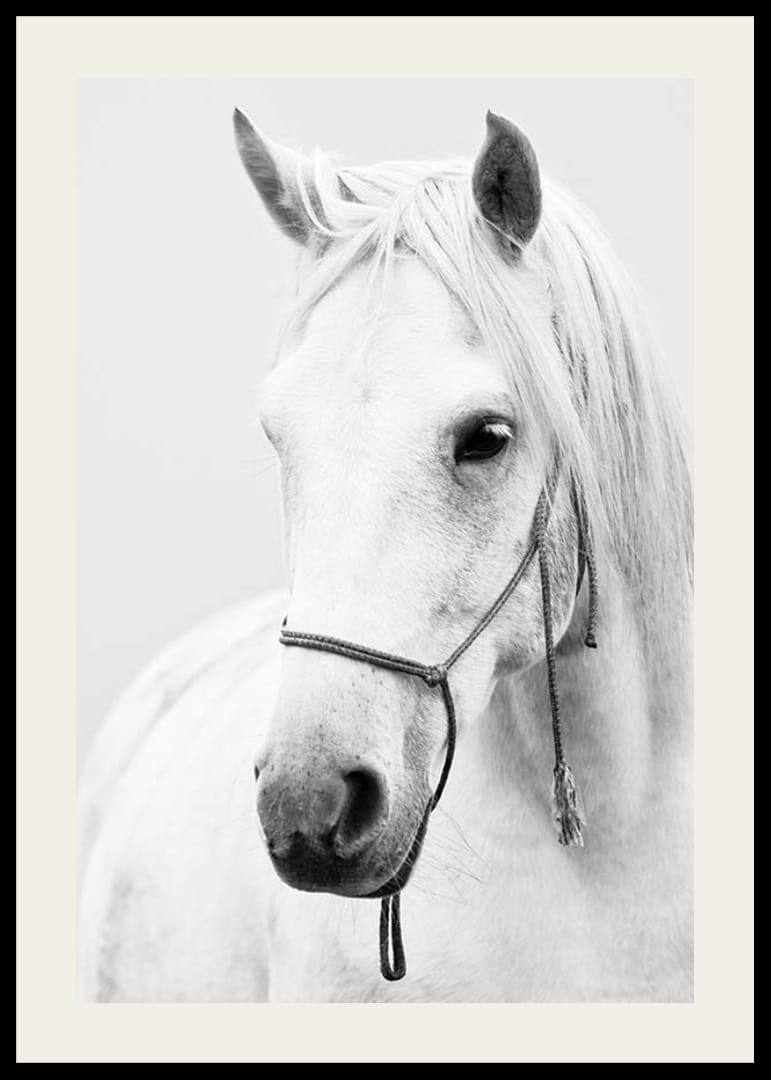 Portræt af en hvid hest med lang man og enkel grime mod en lys, ensfarvet baggrund. Hestens bløde ansigtstræk og detaljerede pels fremstår tydeligt i det sort-hvide farveskema. Denne plakat kombinerer klassiske dyreportrætter med moderne enkelhed og passer ind i alt fra stuen til gangen eller arbejdsværelset.