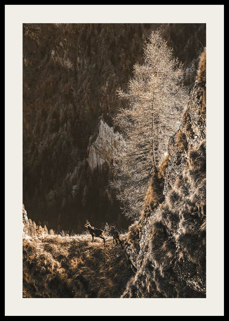 To geder står på en solbeskinnet bjergskråning med tørt græs og en fritstående, lys træstamme ved siden af, omgivet af skarpe klipper og en dyb skov i baggrunden. Efterårsbrune og beige toner giver motivet et naturligt præg. Denne plakat tilføjer et rustikt præg til både stuen og arbejdsværelset.