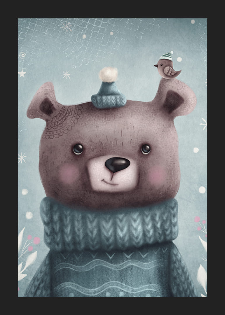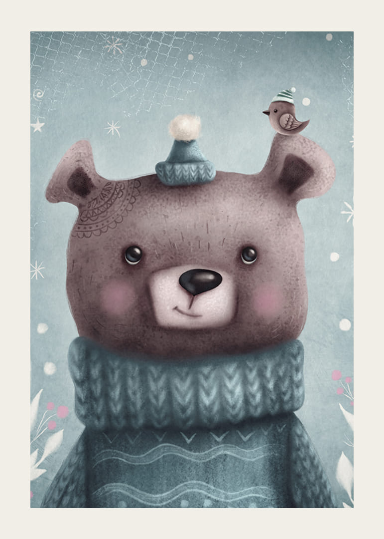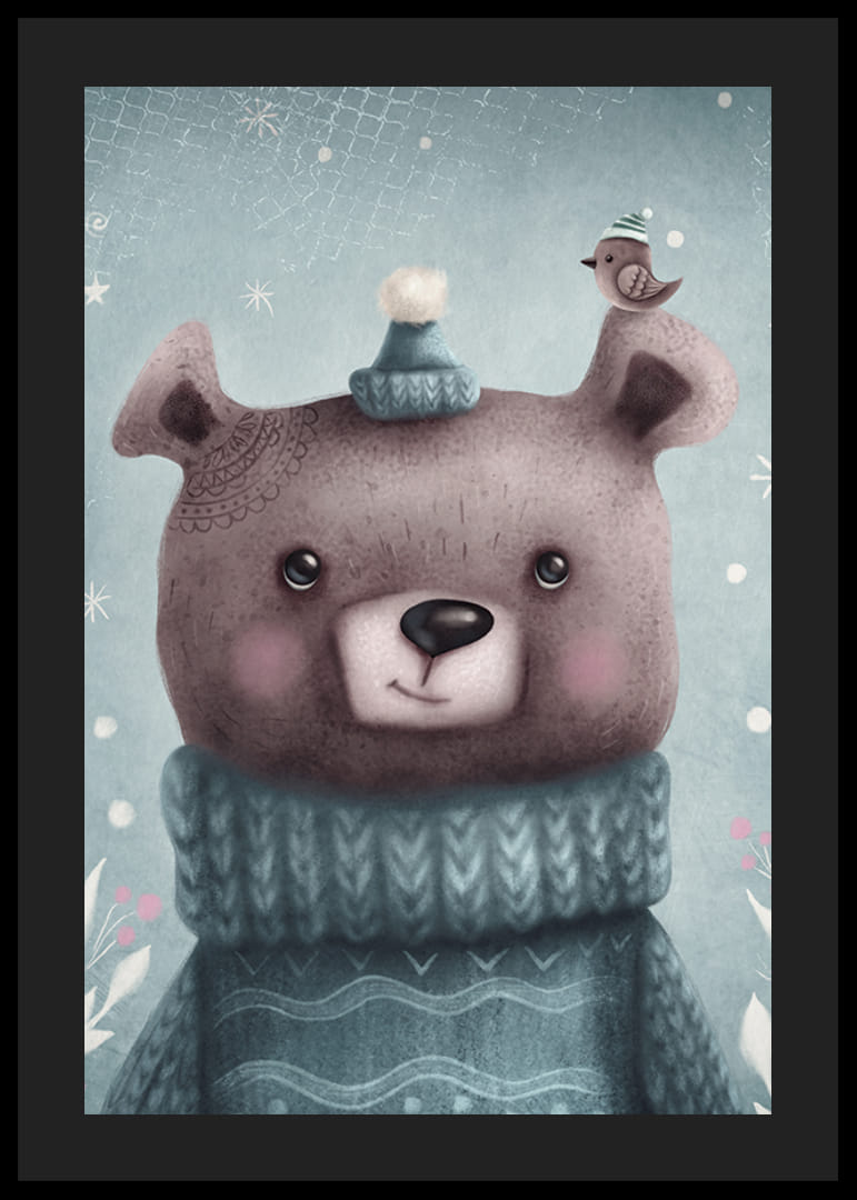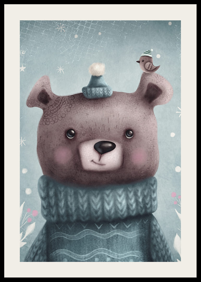 Motivet består af en tegneseriebrun bjørn med en blå strikket sweater og matchende hue. På det ene øre sidder en lille fugl med vinterhue. Baggrunden har kolde blå toner, stjerner og snefnug. Denne plakat bringer et legende vintertema til børneværelset og er perfekt til at skabe en blød og indbydende atmosfære.