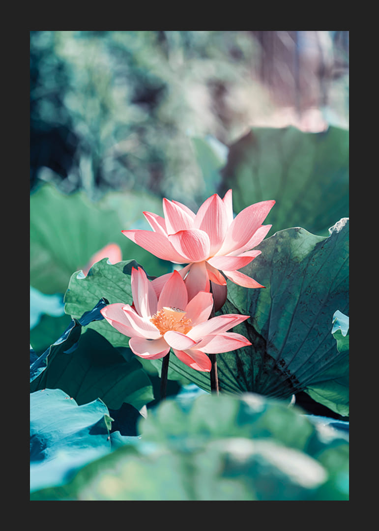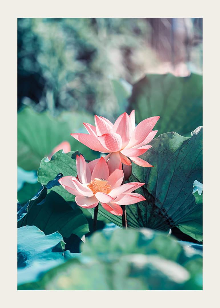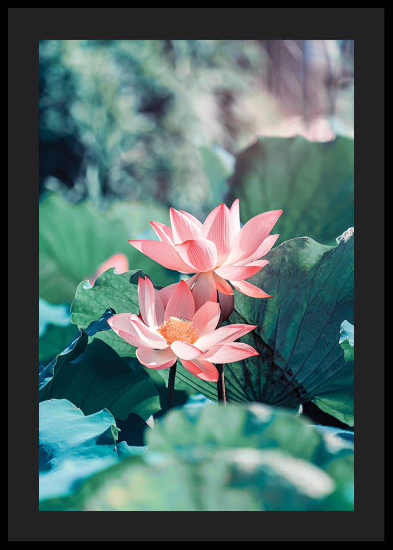 To lyserøde lotusblomster strækker sig op blandt store, grønne blade i blødt dagslys. Fokus er på kronbladenes rene toner, mens baggrunden falmer i bløde nuancer af grønt og blåt. Den botaniske plakat giver en frisk og rolig følelse, især i soveværelser eller stuer, hvor naturmotiver værdsættes.