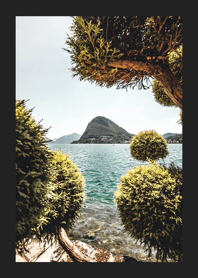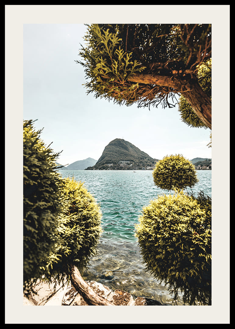 Gennem de grønne trætoppe ses klart turkisblåt vand med et karakteristisk bjerg, der rejser sig på den anden side af søen. Sten i vandkanten og den omkringliggende vegetation giver en rolig og naturlig følelse. Med sit harmoniske motiv passer denne plakat ind i både stuen og på arbejdspladsen.