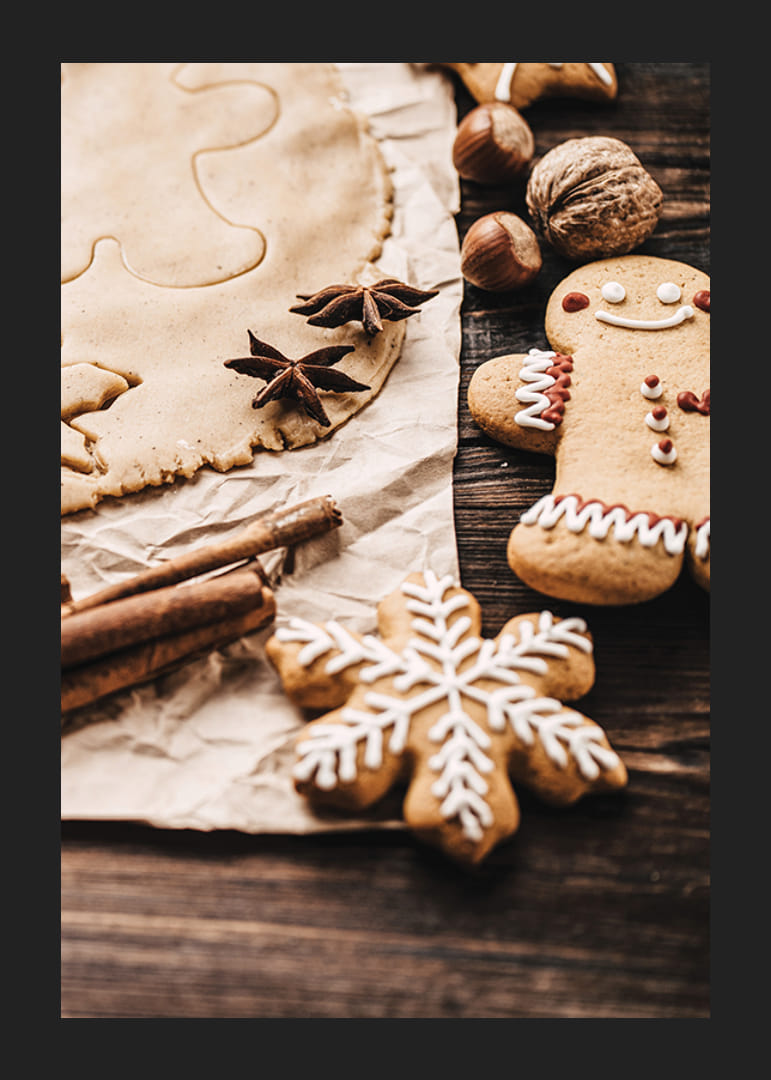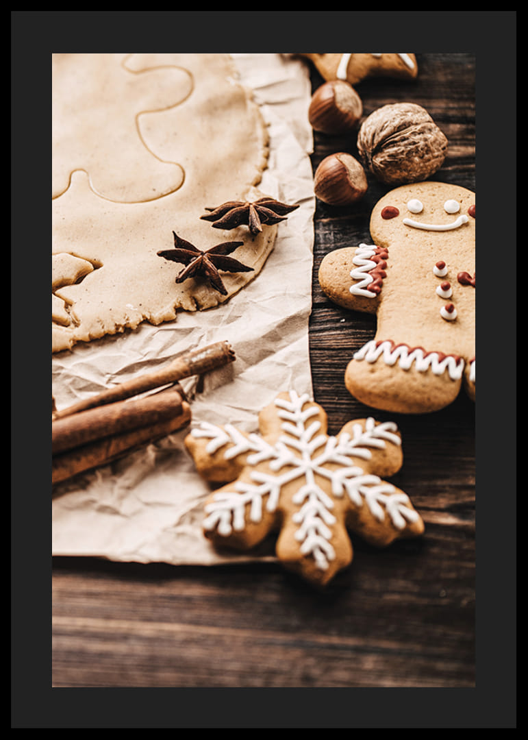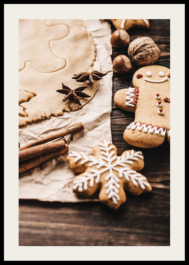 Peberkagedej rullet ud på bagepapir er omgivet af smukt dekorerede småkager formet som en snemand og en snefnug. Stjerneanis, kanelstænger, hasselnødder og valnødder ligger rundt omkring på et rustikt træbord. Denne plakat giver køkkenet eller stuen en klassisk følelse af julebagning og -tradition.