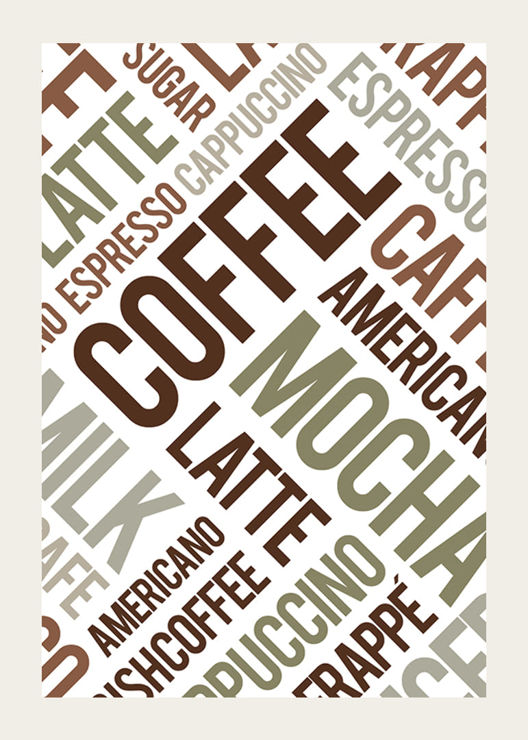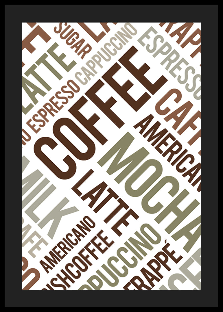 Ord som kaffe, mokka, latte og espresso danner et diagonalt mønster i varierende nuancer af brun, grøn og beige. Den grafiske typografi giver et moderne præg og bidrager til en livlig atmosfære. Denne plakat er perfekt til køkkenet eller i et café-inspireret rum, hvor kaffekultur værdsættes.