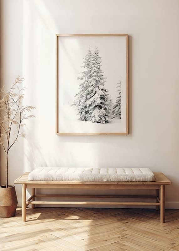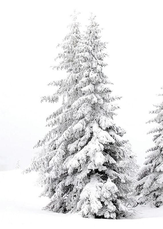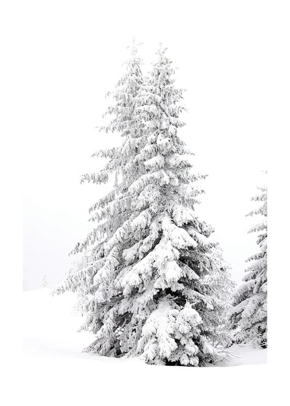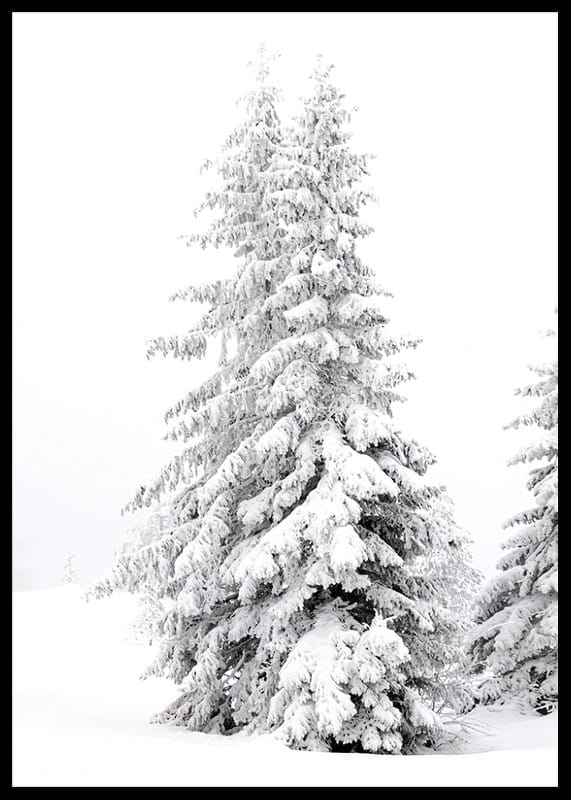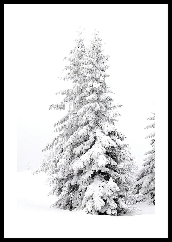 To statelige grantræer dækket af tyk sne står centralt mod en lys, næsten hvid baggrund. Grangrenene hænger tungt under sneen, og landskabet omkring dem er stille og roligt. Denne plakat giver en vinterlig fornemmelse og er velegnet til rum, hvor man ønsker at skabe en rolig og sæsoninspireret atmosfære. En smagfuld detalje til vintermånederne.