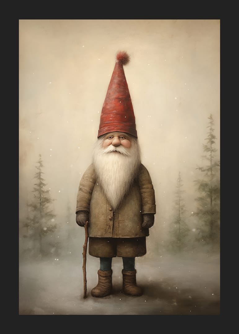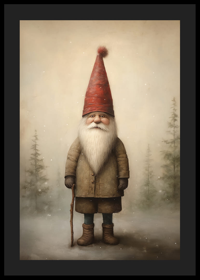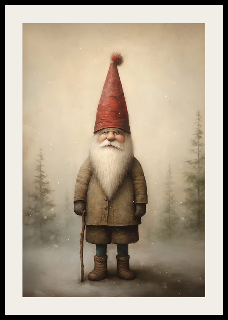 Motivet består af en julemand med langt hvidt skæg, rød skyggehue og stok, der står i en tåget vinterskov med snefald. Dæmpede jordfarver og en diskret baggrund giver en nostalgisk følelse. Denne plakat bidrager til en traditionel julestemning i for eksempel en entré, stue eller børneværelse.