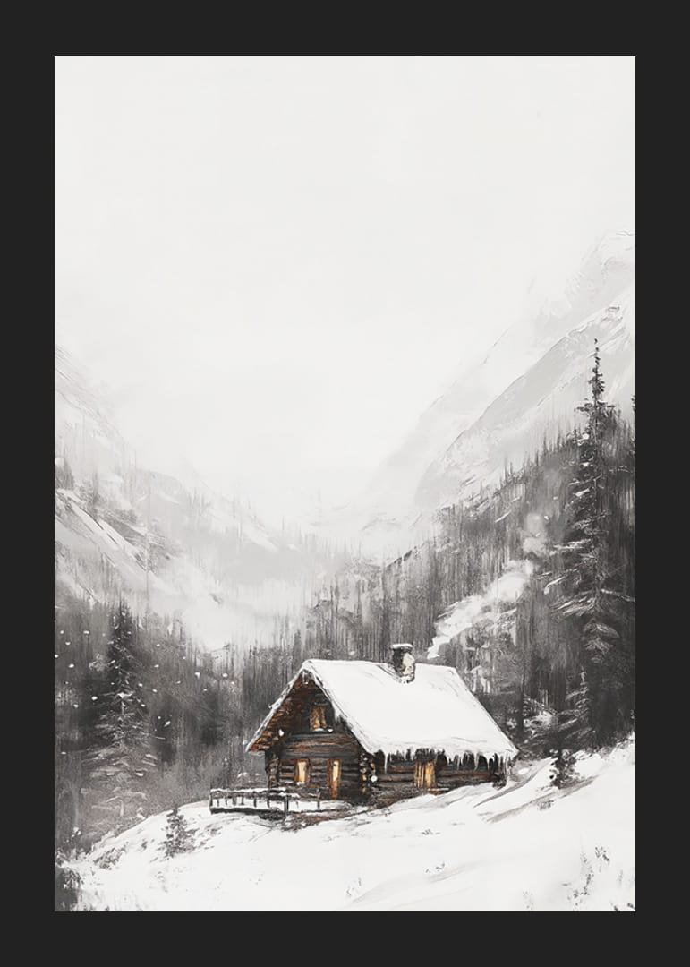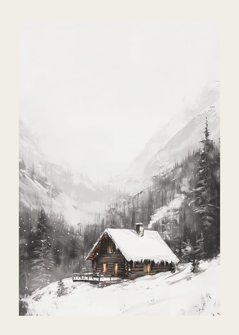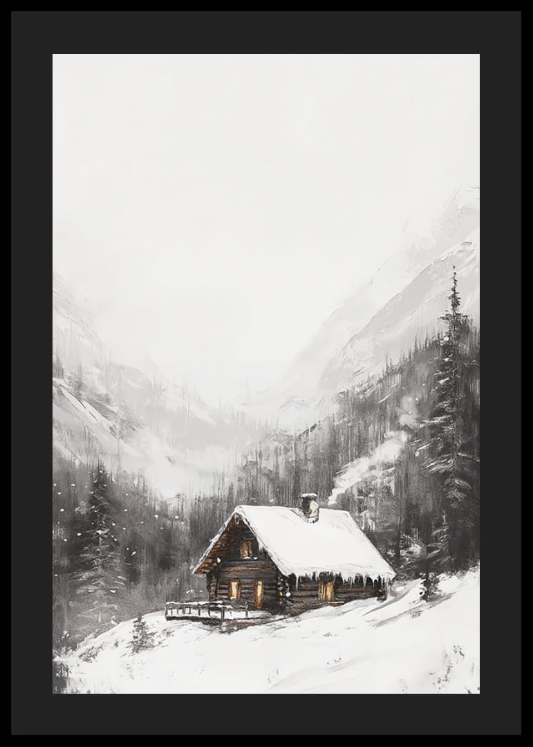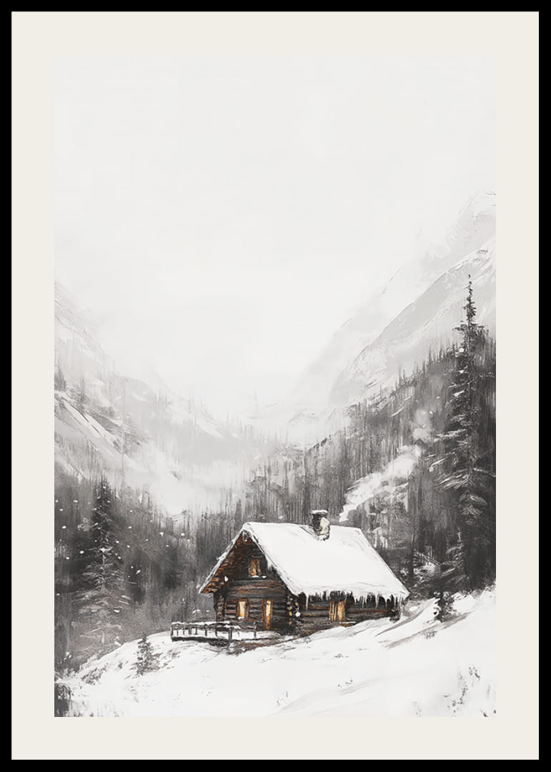 Midt i et snedækket bjerglandskab står en bjælkehytte med oplyste vinduer og stejle tage dækket af sne. Mørke grantræer omgiver hytten, og høje bjerge rejser sig i baggrunden. Diskrete nuancer af grå og hvid dominerer motivet, hvilket giver denne plakat en fredelig og vinterlig følelse i hjemmet.