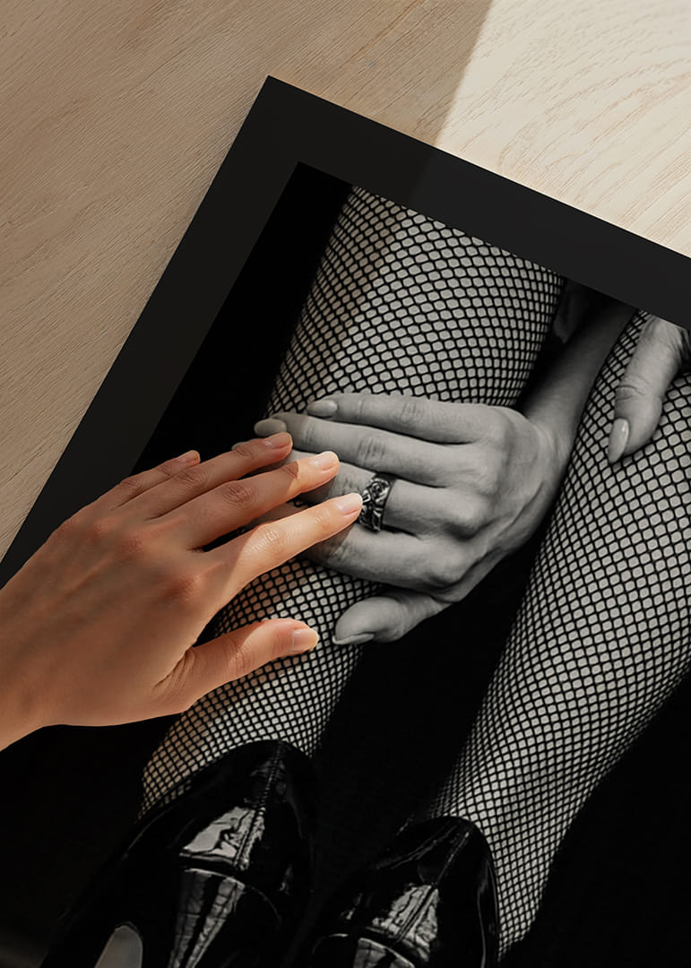 Nærbillede af ben klædt i netstrømpebukser og høje sorte laksko, hvor hænderne hviler over skinnebenene, og en ring er tydeligt synlig. Den stilfulde sort-hvide komposition fremhæver kontrasterne mellem teksturer og former i motivet. En modeinspireret plakat, der tilføjer et grafisk præg til for eksempel en entré eller et soveværelse.